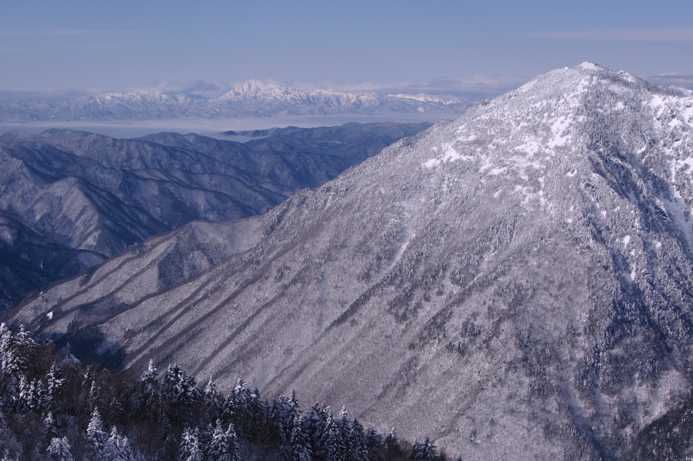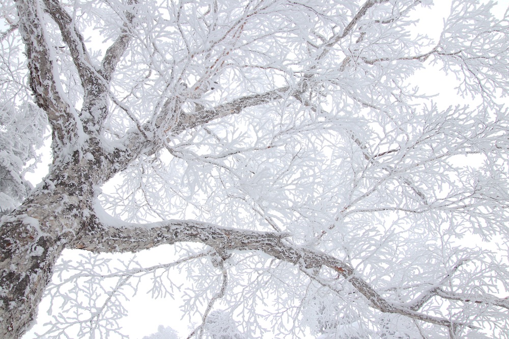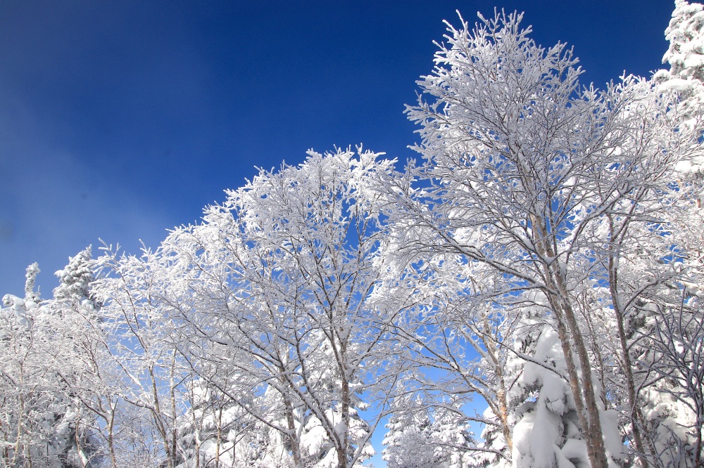 訪れるタイミングによっては、雪山の風物詩である霧氷(むひょう)に出会うことができます。霧氷とは、空気中の水分が過冷却状態で木々に凍りつく現象で、前日の湿度が高く、当日に気温が急激に下がることで形成されます。冬に咲く純白の桜のように木々を覆う霧氷は荘厳で、青空を背景にした霧氷の美しさは格別です。