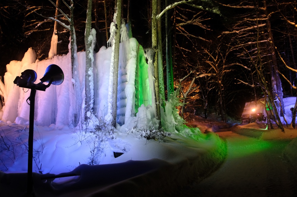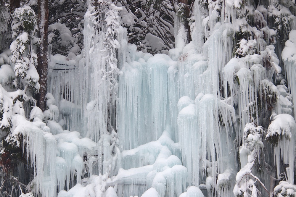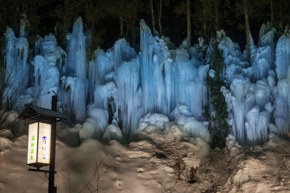 青だるとは、岩から滴る水が凍りつき、青い水の帯のように見える現象のことを指します。本来は山奥でしか見られない自然の産物ですが、福地温泉では沢の水を温泉街の木々に噴霧することで青だるを再現しています。不思議な造形は思わず見入ってしまうほどの美しさです。