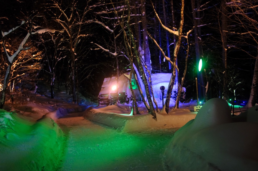 また、奥飛騨ガーデンホテル焼岳(やけだけ)では、ホテル独自のライトアップイベント「雪ほたる」が開催されています。カラフルなライトが静寂に包まれた冬の森を彩り、情緒あふれる夜の散歩を楽しむことができます。年によってはかまくらが作られることもあり、雪や氷の造形をライトアップした幻想的な世界は必見です。