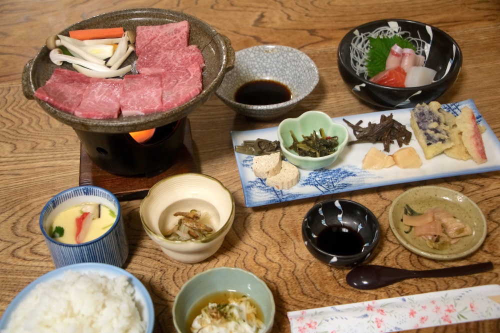 この宿の醍醐味は、ご主人が自ら作り上げたヒノキの内湯です。身体を芯から温めてくれる塩化物泉のお湯を堪能しながら、ヒノキの香りに包まれる入浴体験は格別です。女将さんが手がける料理も素晴らしく、飛騨牛の陶板焼きや岩魚の塩焼き、山菜のてんぷら、お刺身など、思わず頬が落ちる美味しさです。