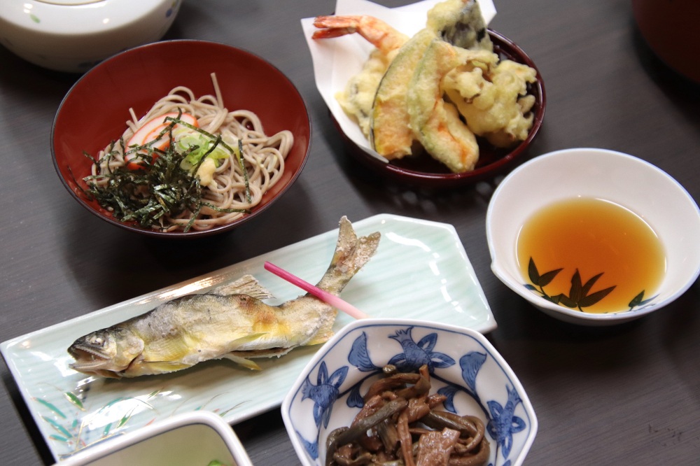 内湯はシンプルながらも広々としており、お湯がたっぷりオーバーフローしています。無色透明のさっぱりとしたお湯は、身体を芯から温め、効能をしっかり感じられます。夕食もボリューム満点で、トロトロの茶碗蒸しや絶妙な味付けの佃煮、飛騨そばなど、美味しい手料理の数々に大満足です。