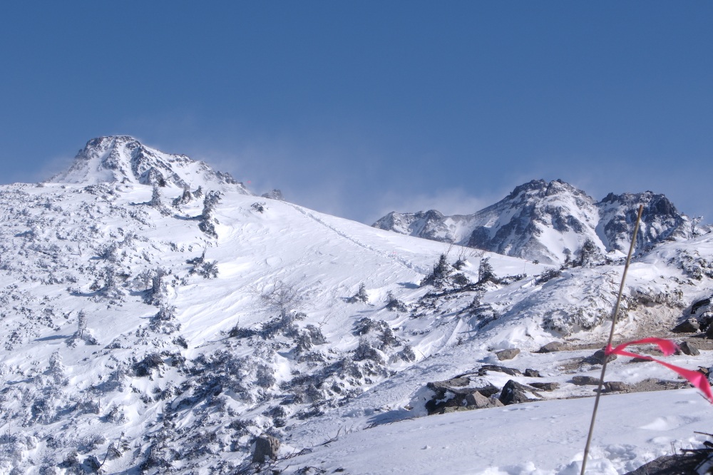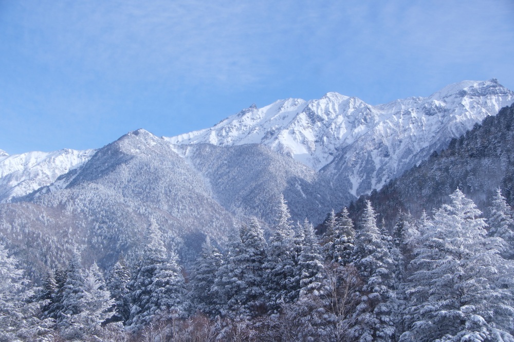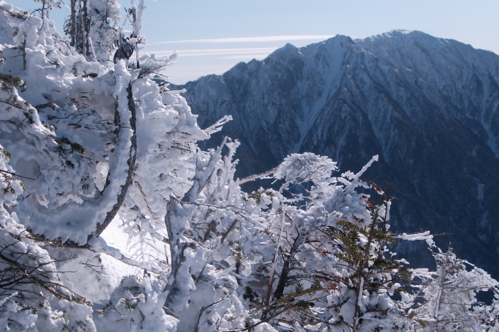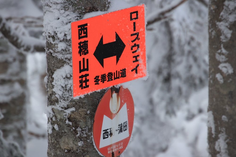 気候条件が揃えば、霧氷(空気中の水分が過冷却で木々に付着する現象)が見られることも。冬の山ならではの自然が作り出す美しい光景です。登山口は槍の回廊から徒歩約5分の場所にあり、山小屋が目印となっています。天気の良い土日休みであれば、しっかりトレース(足跡)が残されていることも多く、安心して雪山の世界に入山できると思います。