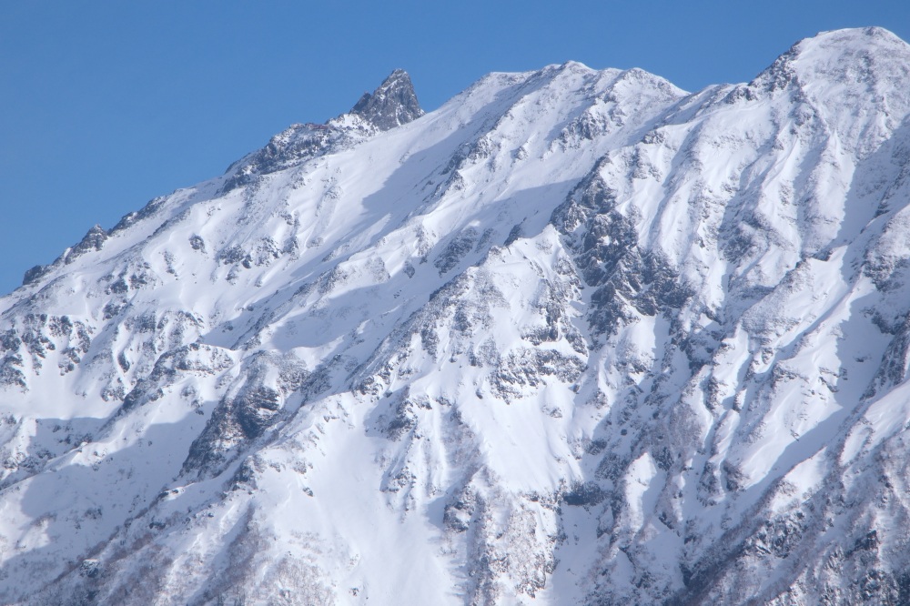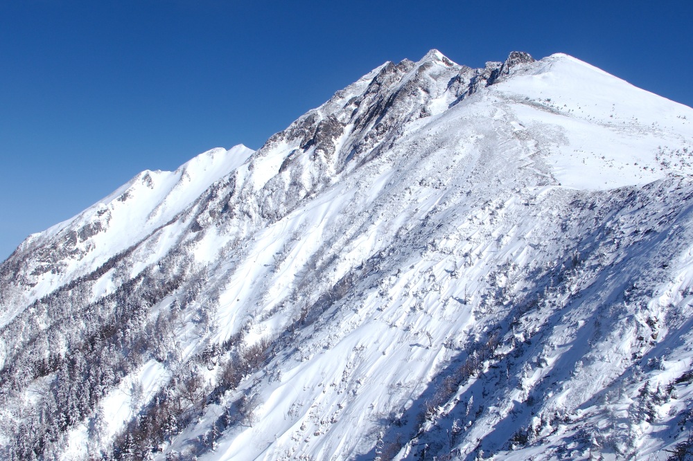 ピラミッドのようにそびえる西穂高岳(標高2,909m)、雪壁のようにそそり立つ笠ヶ岳(標高2,898m)、天を突くような鋭い槍ヶ岳(標高3,180m)など、北アルプスの主要な山々が目の前に広がります。荒々しい山肌と滑らかな雪面が織りなす、この時期だけの迫力ある景色に、思わず息を呑んでしまうはず。