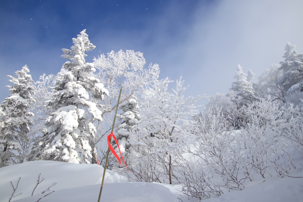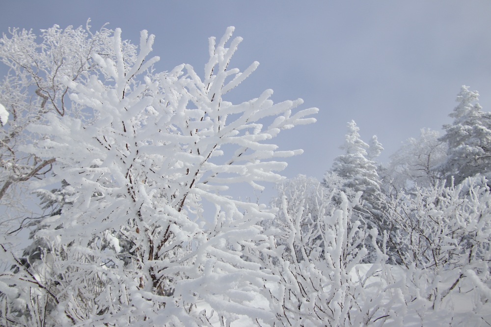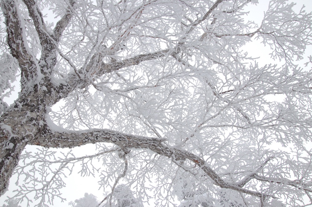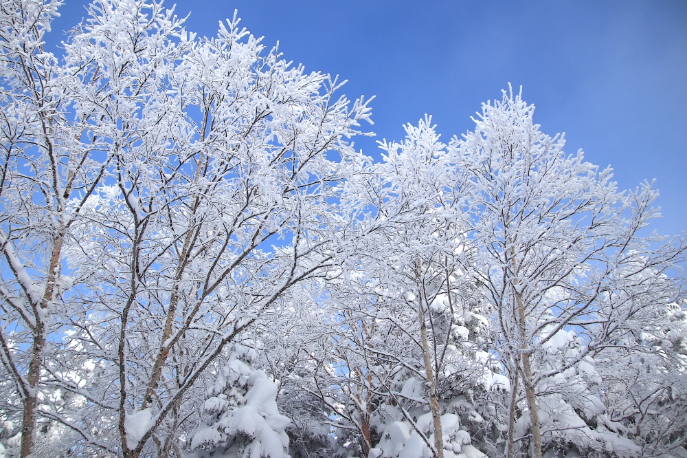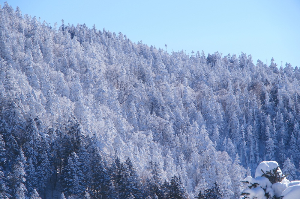 純白に染まった森は、雪がない時期とは違い、さまざまな表情を見せてくれるのが魅力です。雪面に光が反射して紋様を描いたり、木々から垂れる氷柱が輝いたり、明暗のコントラストで浮かび上がる樹氷など、絶好のシャッターチャンスが続きます。また、雪を踏みしめる感触も雪山特有の楽しみです。