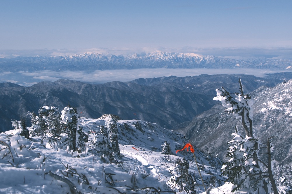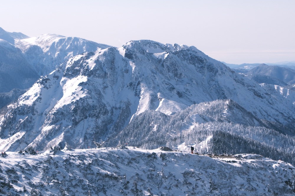 登山を開始してから約1時間半で西穂山荘に到着します。樹林帯を抜けると、一気に視界が開けます。正面には、いくつもの峰が連なる乗鞍岳(標高3,026m)がそびえ、その反対側には、山間の町を挟んで白く輝く白山連峰が広がります。冬の朝には雲海が広がることも多く、壮大な景色が楽しめます。