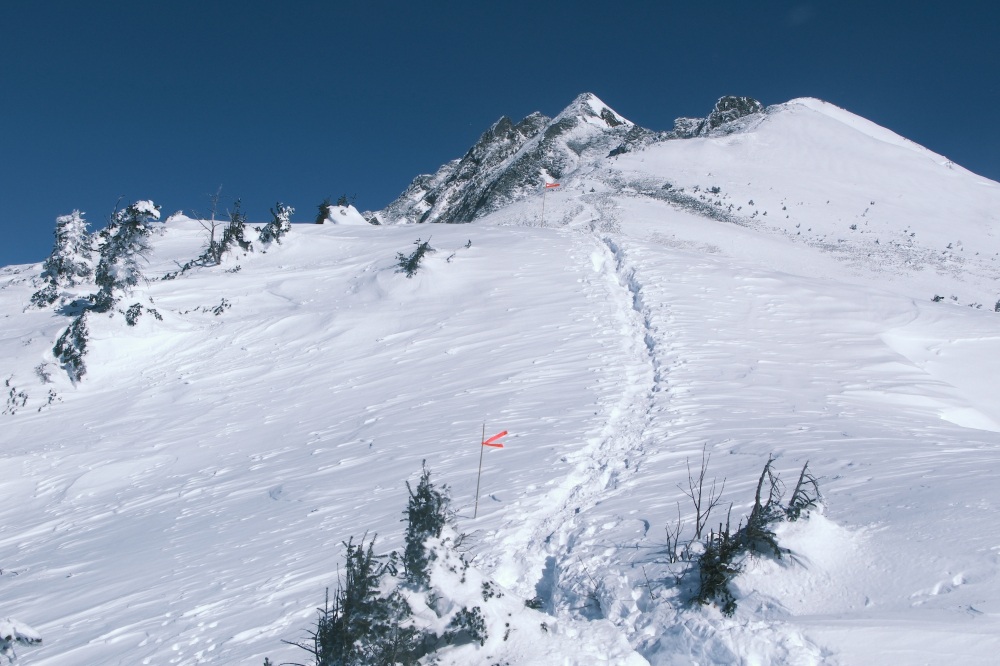 中級者であれば、西穂丸山からさらに進んで西穂独標(標高2,701m)まで行けますが、雪山登山の経験が少ない方は、西穂丸山で引き返すのが無難です。帰りには、乗鞍岳へ続く稜線を進みながら雄大な下山を楽しむことができます。下山時には足を滑らせやすいため、必ずアイゼンを装着してくださいね。