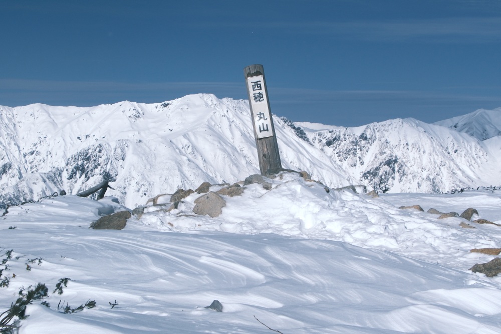 西穂山荘から約30分ほど歩くと、西穂丸山(標高2,452m)に到着します。山頂からはパノラマの絶景が広がり、息を呑むほどの景色を楽しめますが、道中には危険な箇所がないので安心です。山頂標識の前には、大迫力の西穂高岳がそびえ立ち、冬は上級者のみが立ち入れる聖域となっています。夏に登頂経験がある筆者にとっては、どこか懐かしく、憧れの山でもあります。