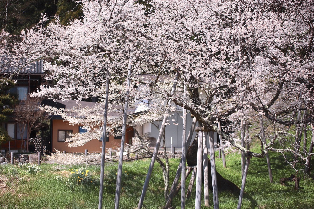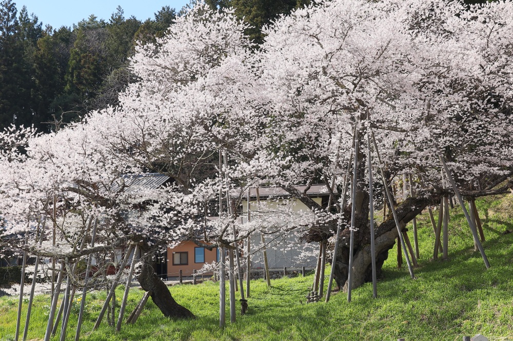 春になると、淡いピンクの花が枝いっぱいに咲き誇り、爽やかな青空とのコントラストが美しく映えます。この桜は高山市の指定天然記念物にも登録され、長い年月を生き抜いてきたその生命力と佇まいが、見る者を圧倒します。