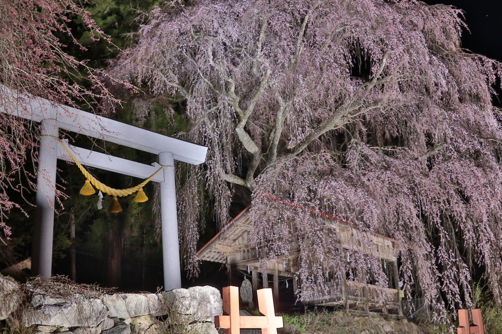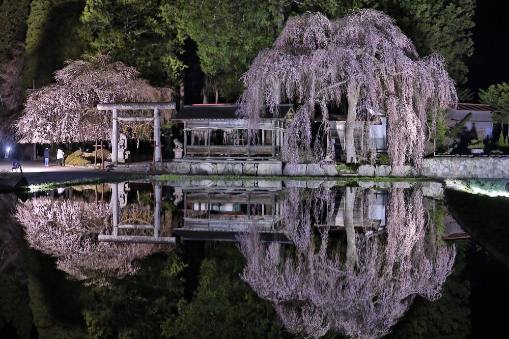 特に見応えがあるのは、二つの神明神社です。浅井地区の神明神社には、飛騨あさひ地域で最大級のしだれ桜があり、その大きな枝が堂を覆いかぶさるように咲き誇ります。一方、青屋地区の神明神社では、水田に映る夜桜の水鏡が見られ、その静寂な夜の中で息を呑むような幻想的な光景が広がります。