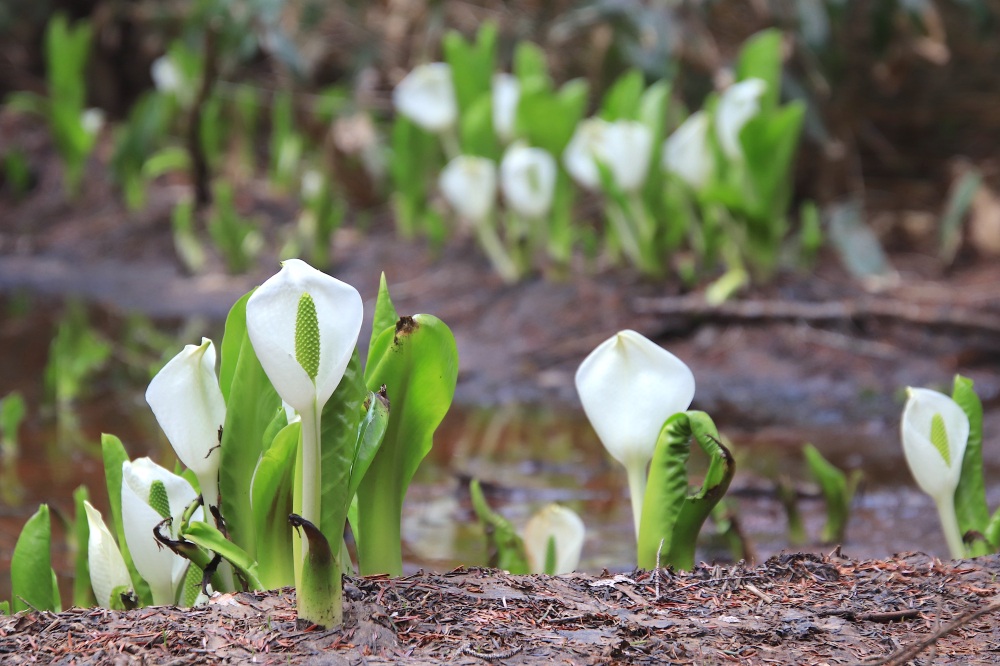 奥飛騨の人気観光名所である「新穂高ロープウェイ」。その終点、西穂高口駅付近の園地では、雪解けが進む6月に水芭蕉が見頃を迎えます。標高2,000mを超える場所での水芭蕉の群生は、全国的にも非常に珍しいです。