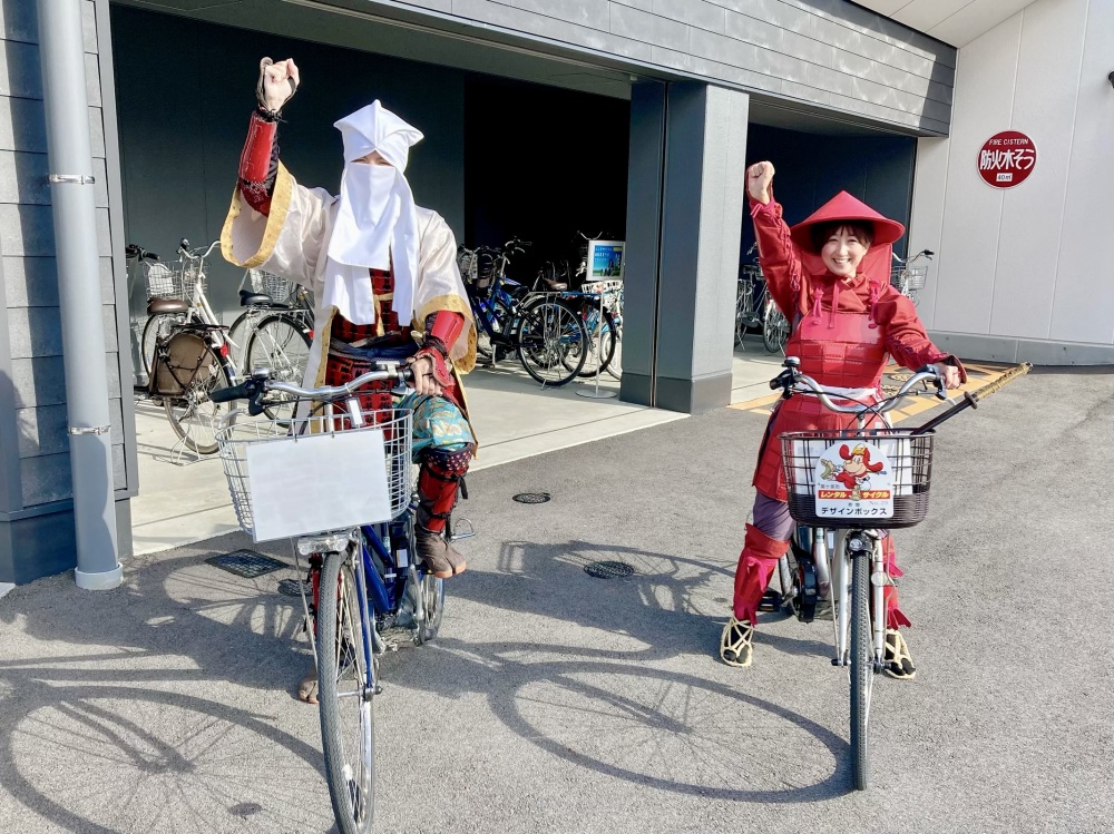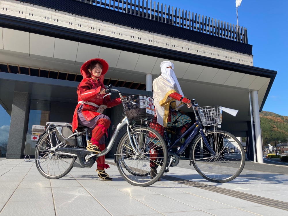 大谷吉継さんイチオシはレンタサイクル。「関ケ原の広い陣跡を効率よく巡るには現代の馬(自転車)を借りるのがよい」と吉継公。坂道もスイスイ登れる電動アシスト付き自転車や、子供用自転車の取り扱いもあります。