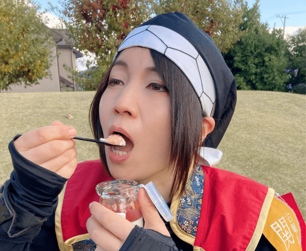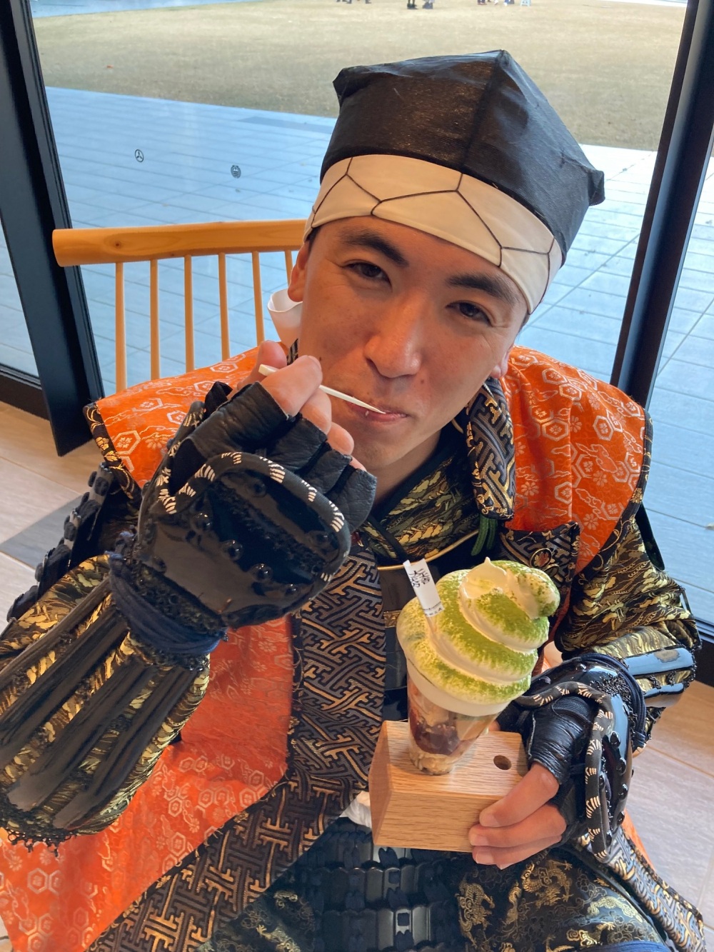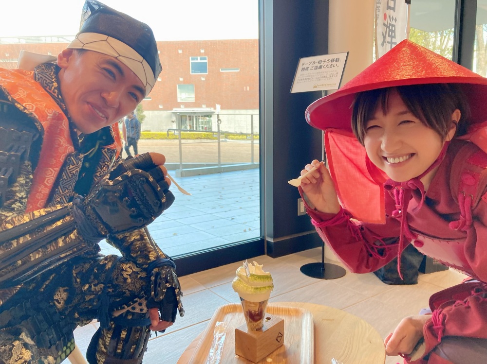 「甘味を楽しむのも旅の楽しみの一つ。ワシの名を冠したパフェはいかがじゃ?」と三成さん。三成といえば「三献茶のエピソード」が有名。