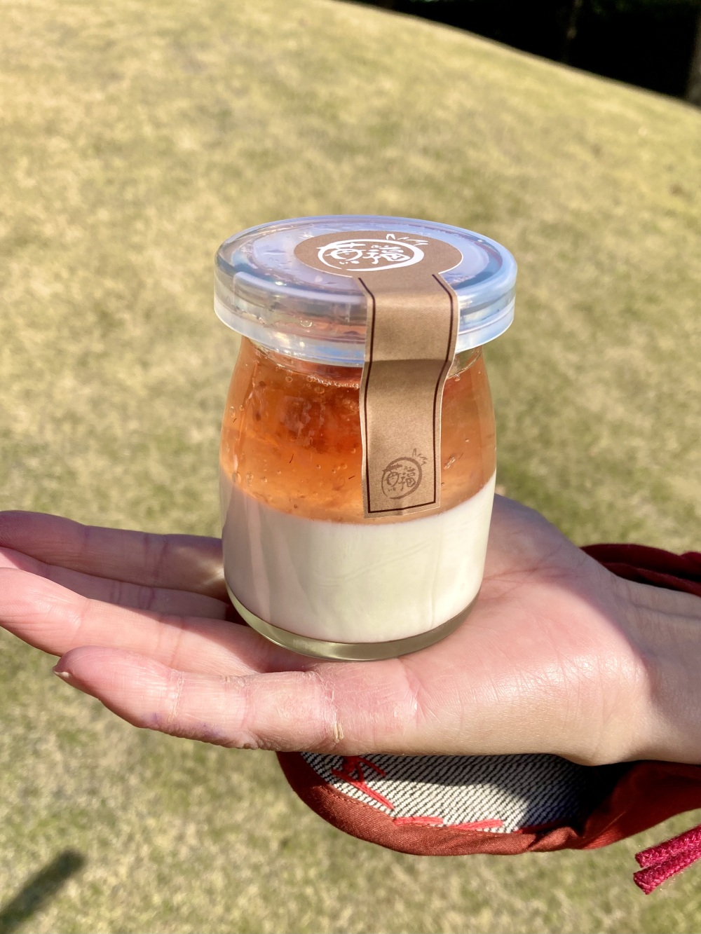 細川興元さんが「お勧めしたき、甘味があるのじゃ!売り切れの時もあるゆえ人気商品である」と絶賛するのは、別館ショップで販売されている「苺福みるくぷりん」。