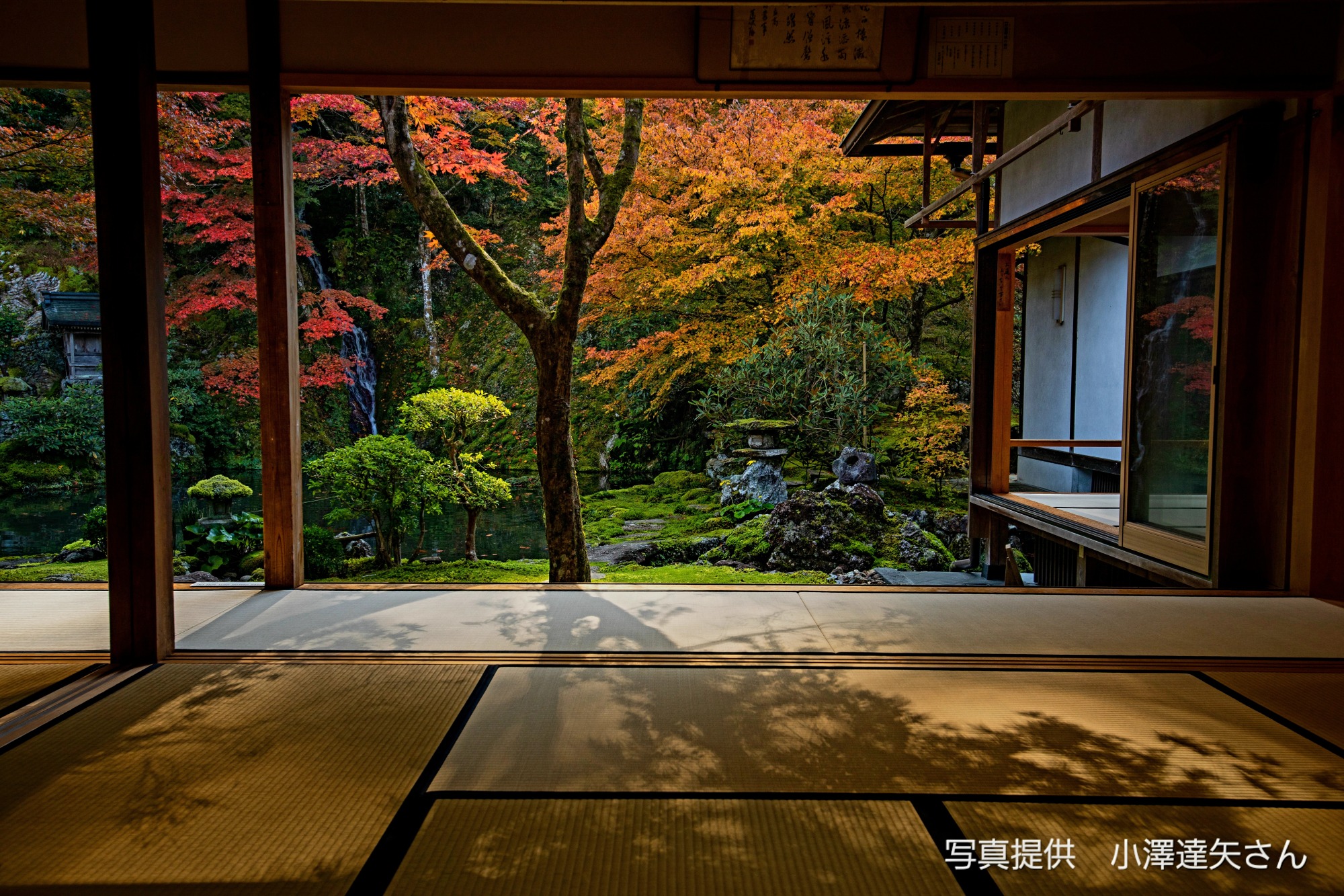 露地門(茶室に続く露地の出入口にある門)と庭園。苔むした庭と紅葉の調和が美しいだけでなく、地面の苔に映し出された木々のシルエットもとても印象的です。