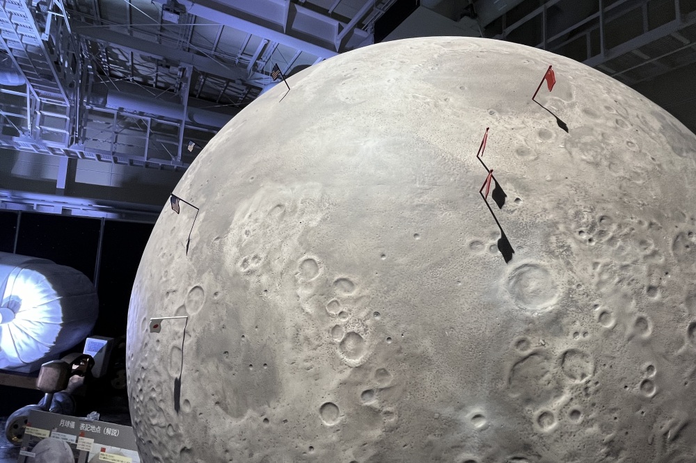 月球儀に、各国が月面に着陸した場所に国旗が記されています。