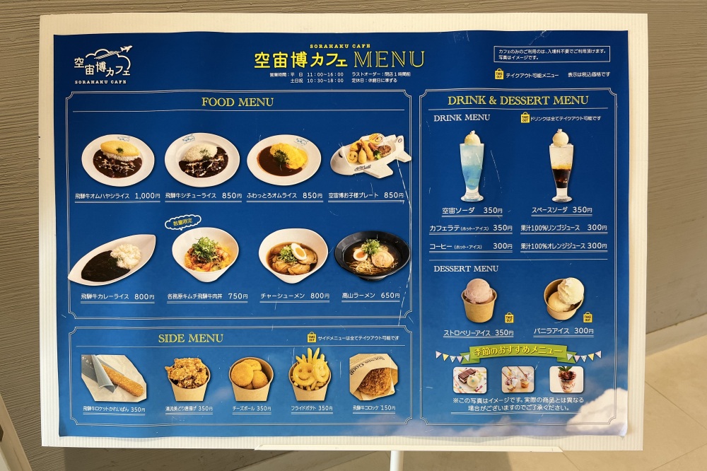 飛騨牛を使用したオムライスやカレー、ラーメンの他、唐揚げやフライドポテトなどのサイドメニューもあります。
