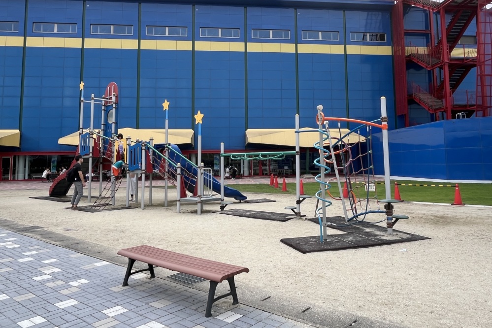 まるで滑走路を歩いているみたい。飛行機を眺めたり写真を撮ったりして、なかなか建物にたどり着けない人も?遊具広場もありますよ。