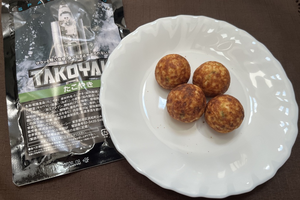たこやきは宇宙食の中でも人気ナンバーワン!フリーズドライ製法で、具の中にちゃんとタコも入っていました。