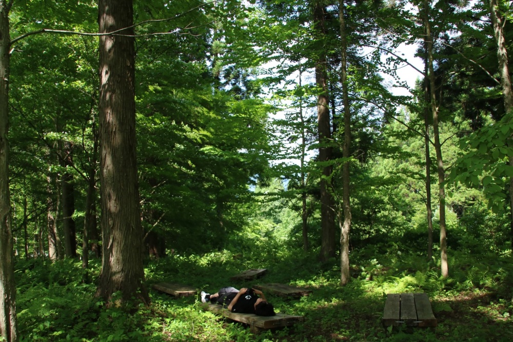 「キイチゴ」や「ヤマグワ」の実も見つけました。休憩できる場所があったので、寝転んで深呼吸をしてみました。目を閉じると、風で草木が揺れる音ややわらかな光を感じ、自然を全身で味わうことができて、心からリラックス。思わず一瞬眠ってしまいました。できることならずっとここで眠っていたかったです。