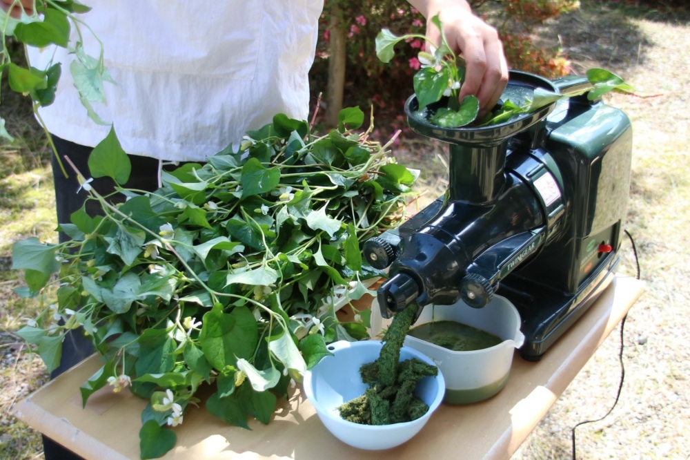 山の中でも見つけられた「ドクダミ」。生で絞ったり、乾燥させたりと、さまざまな使い方ができる植物です。古川の町には、ドクダミを生絞りできる場所もあるそうです。