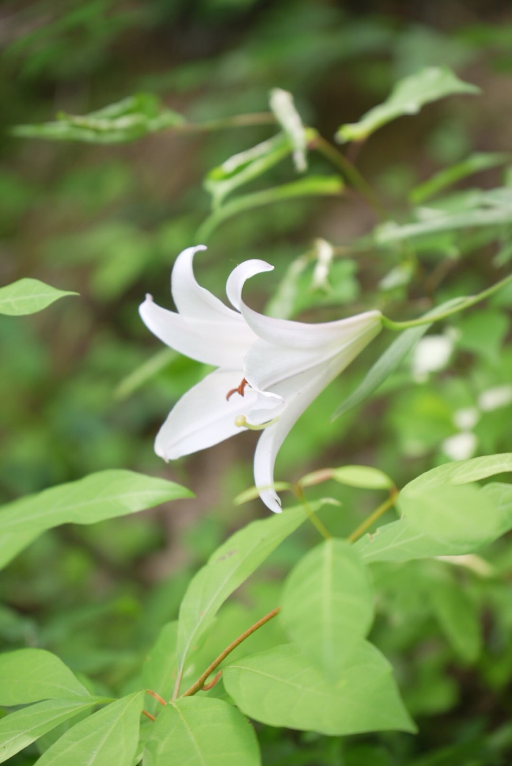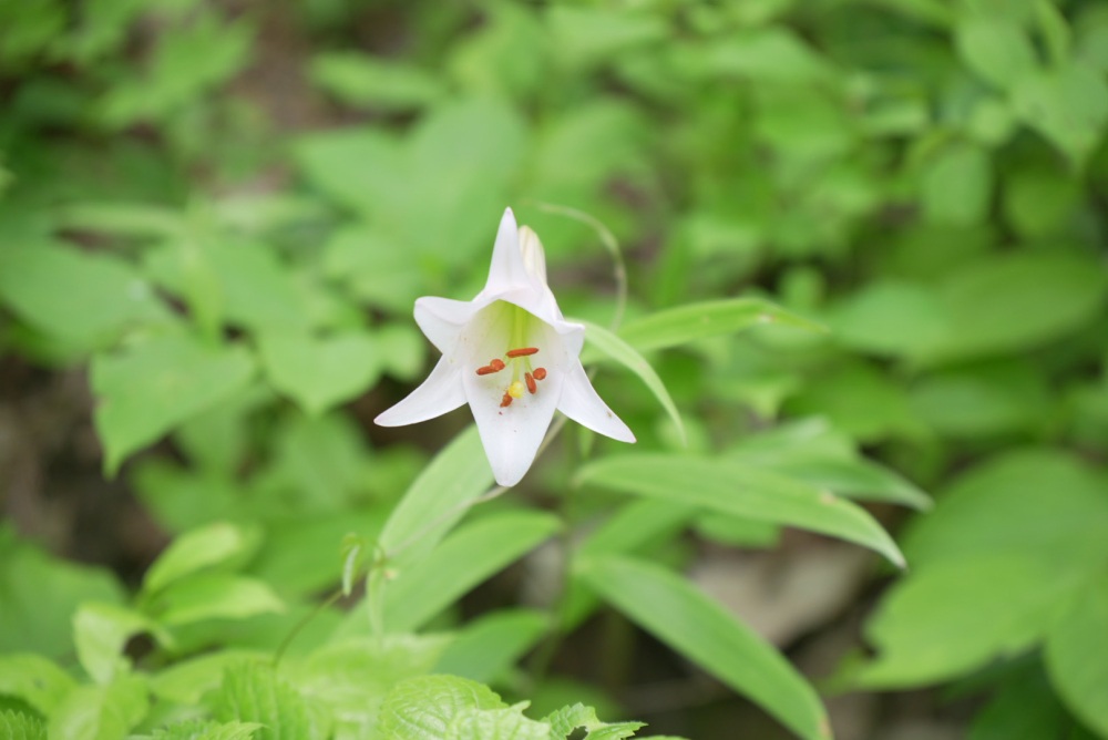 草木の間に白い花が咲いていて、「ササユリ」と教えていただきました。花屋で見かけるような大きく豪華なユリとは少し違い、とても繊細な印象を受けました。葉の形が笹に似ていることから「ササユリ」と名付けられたそうで、日本特産のユリとして「ヤマユリ」とも呼ばれています。
