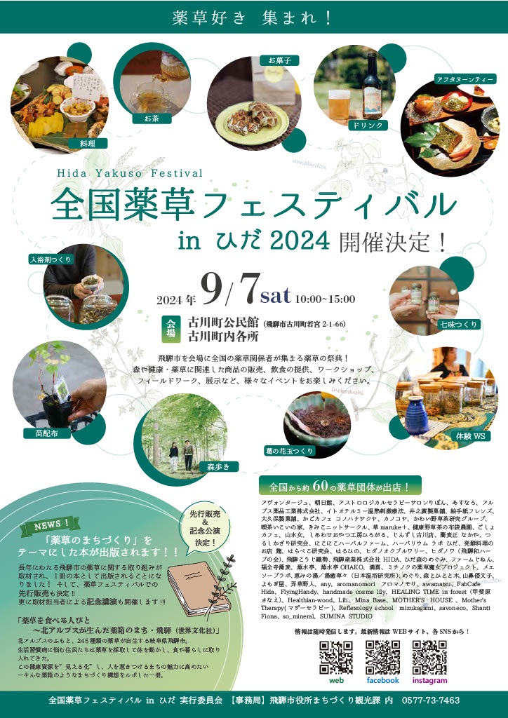 飛騨市には、245種類以上の薬草が自生しています。2024年9月には「第1回全国薬草フェスティバル in ひだ」も開催され、注目が集まりました。イベントがない時でも、古川の町には薬草を使った工夫が随所に見られます。