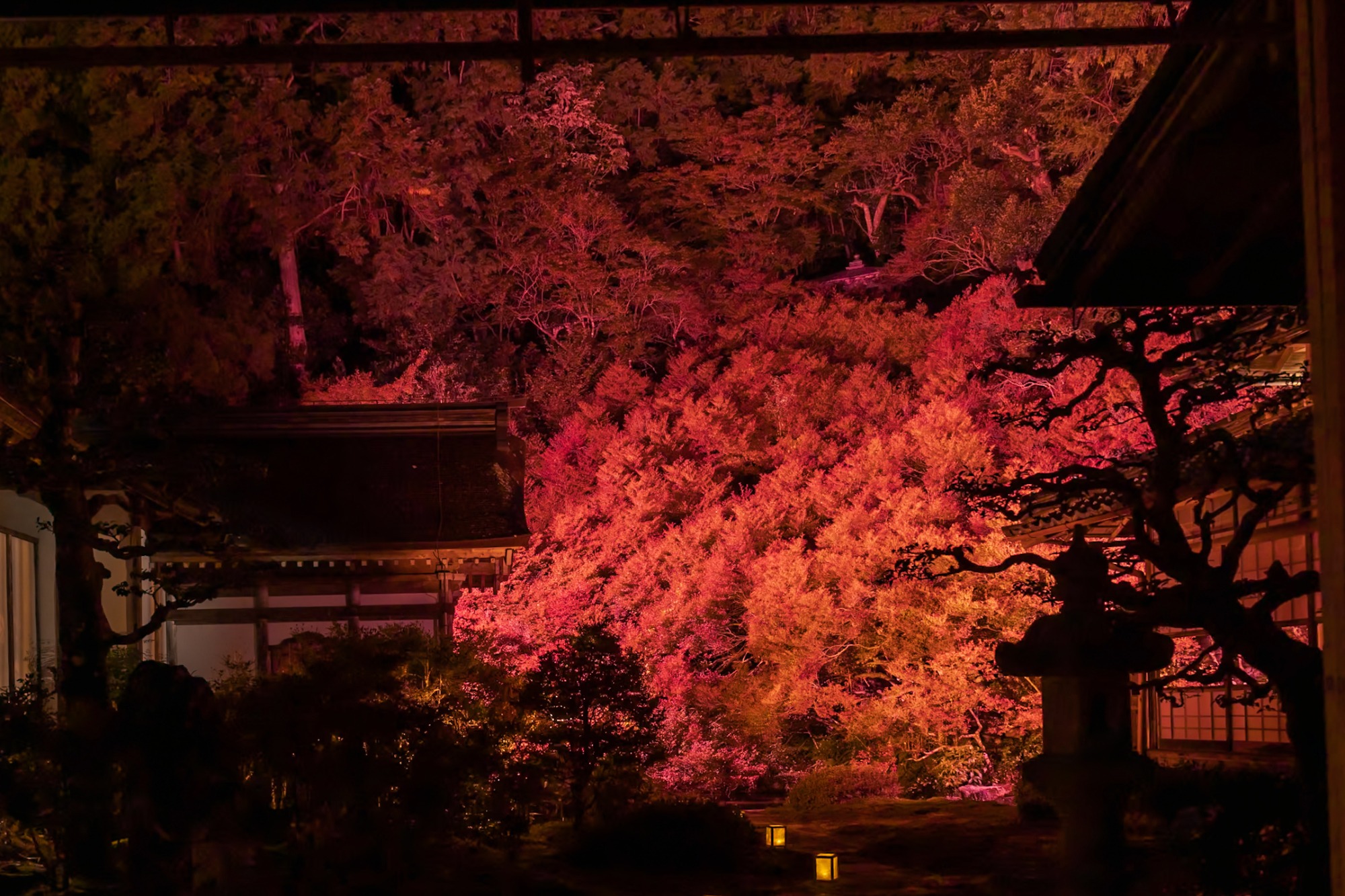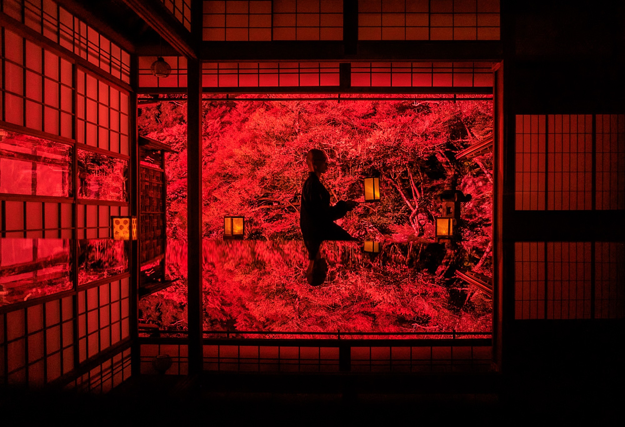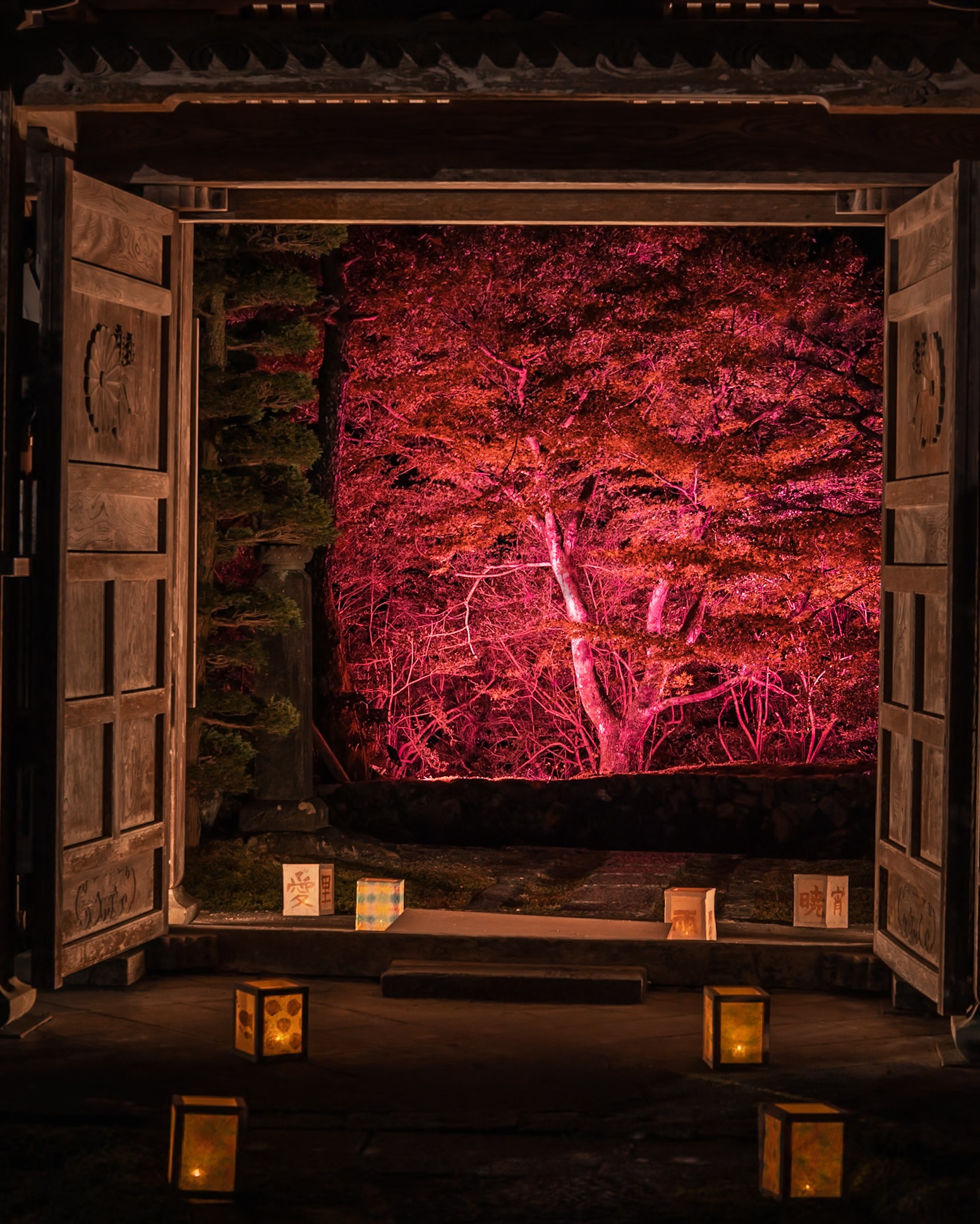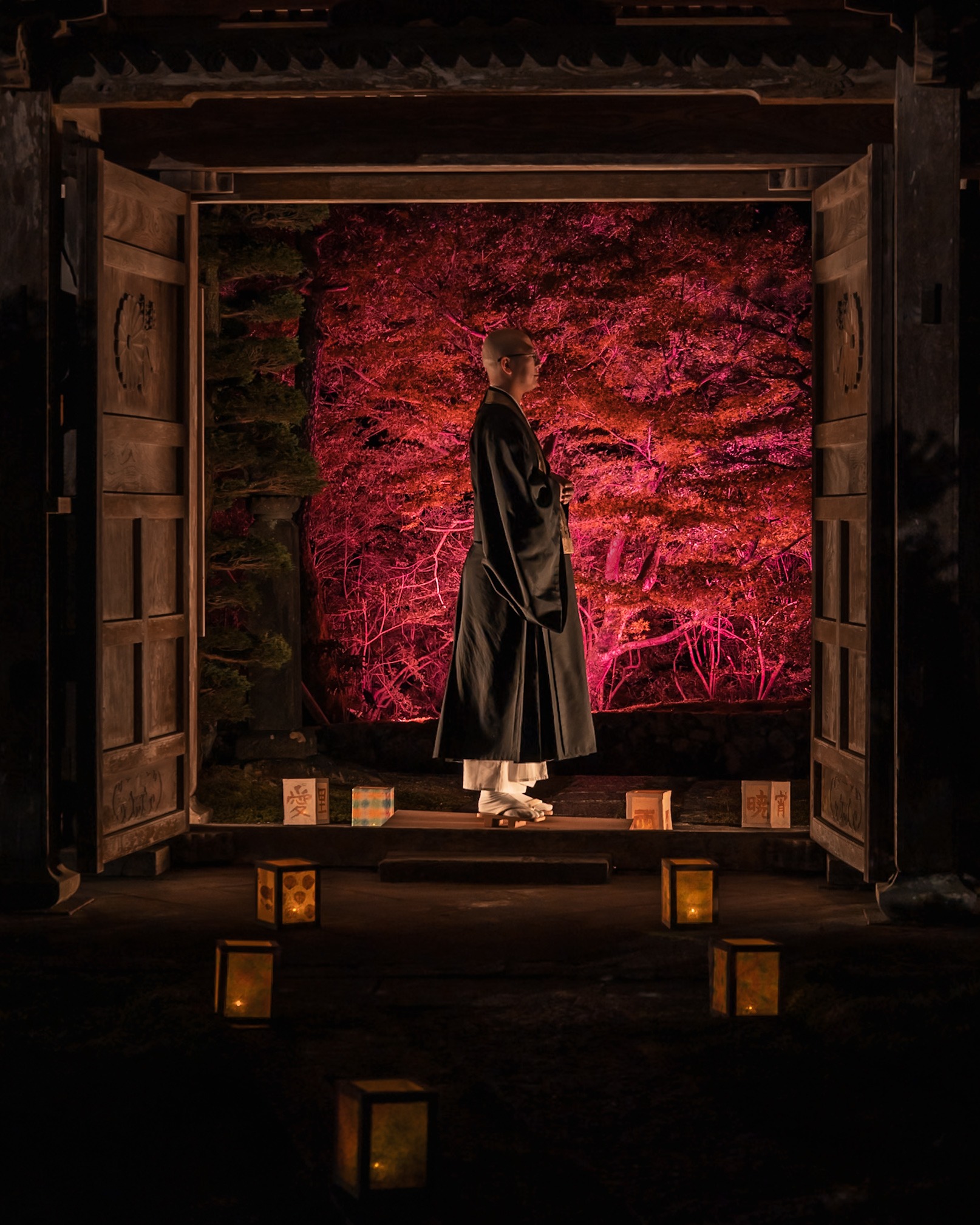 真っ赤なドウダンツツジのお庭と住職さまのシルエット!ため息が出るほど美しかったです。行灯を貸していただけるので、思い出にご自身が入るのもおすすめです。その際はスタッフの方が撮影してくださいます。