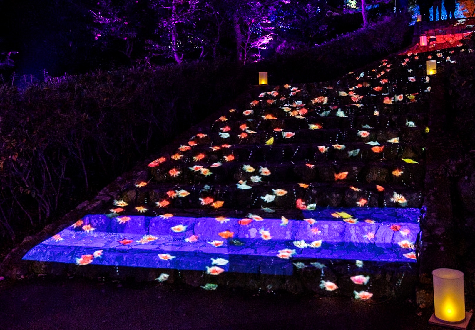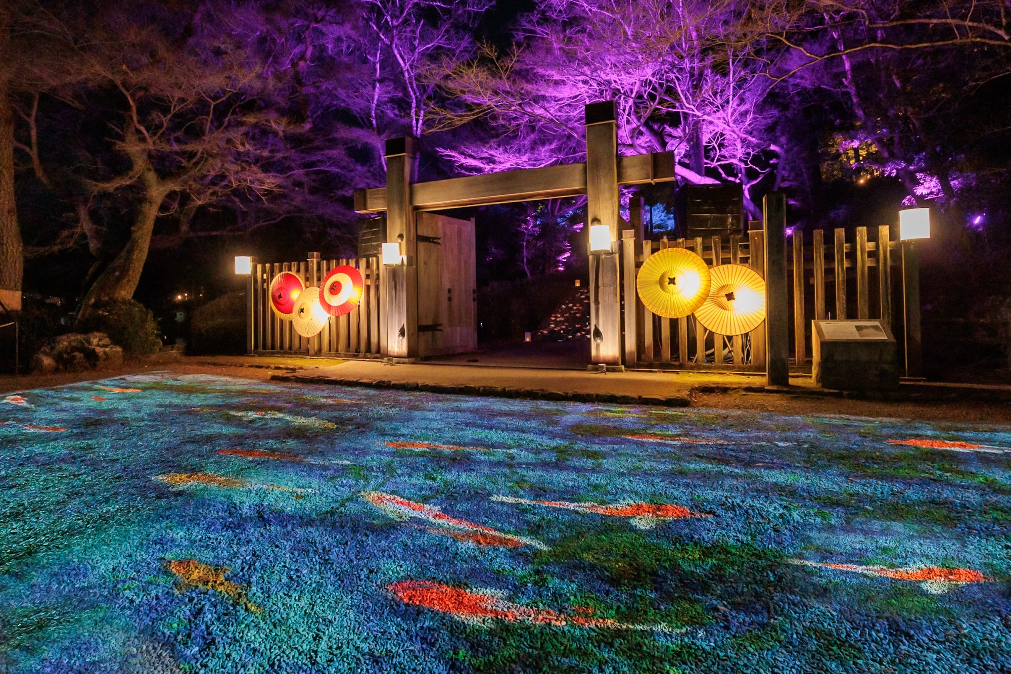 岐阜公園エリアの入口となる冠木門前(かぶきもんまえ)では、美しく幻想的なプロジェクションマッピングにより池を優雅に泳ぐ鯉の演出もあり、よりパワーアップした ぎふ灯り物語 の世界を体感いただけます!