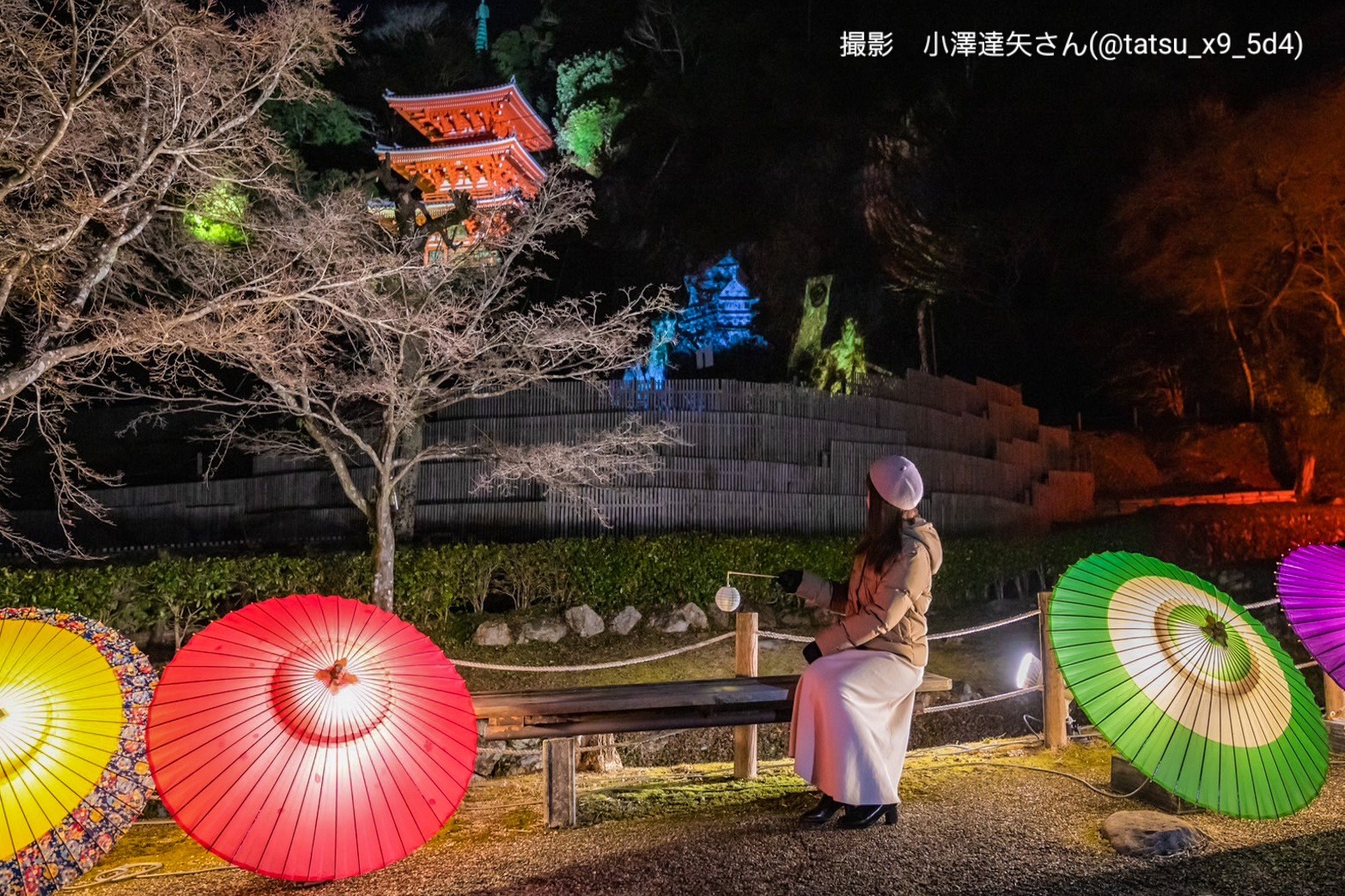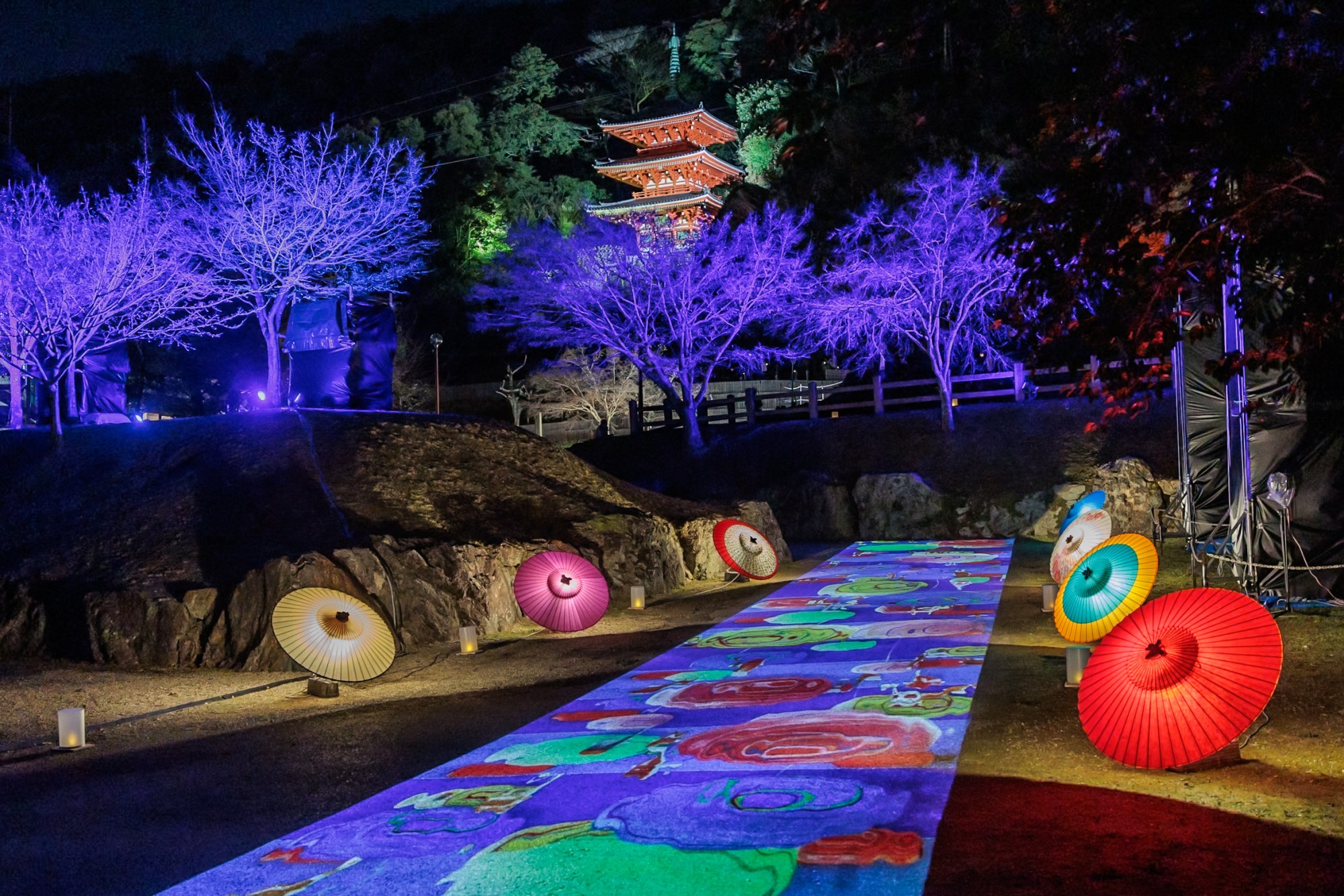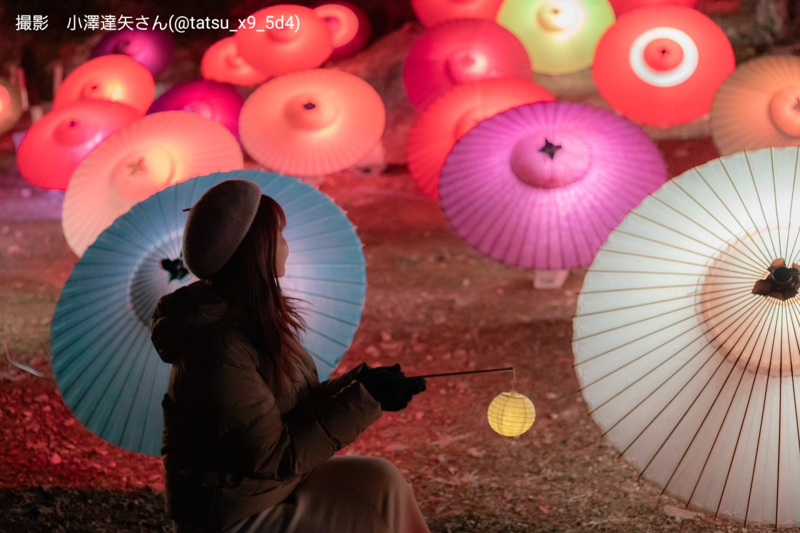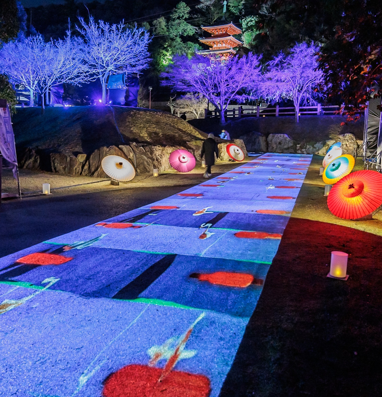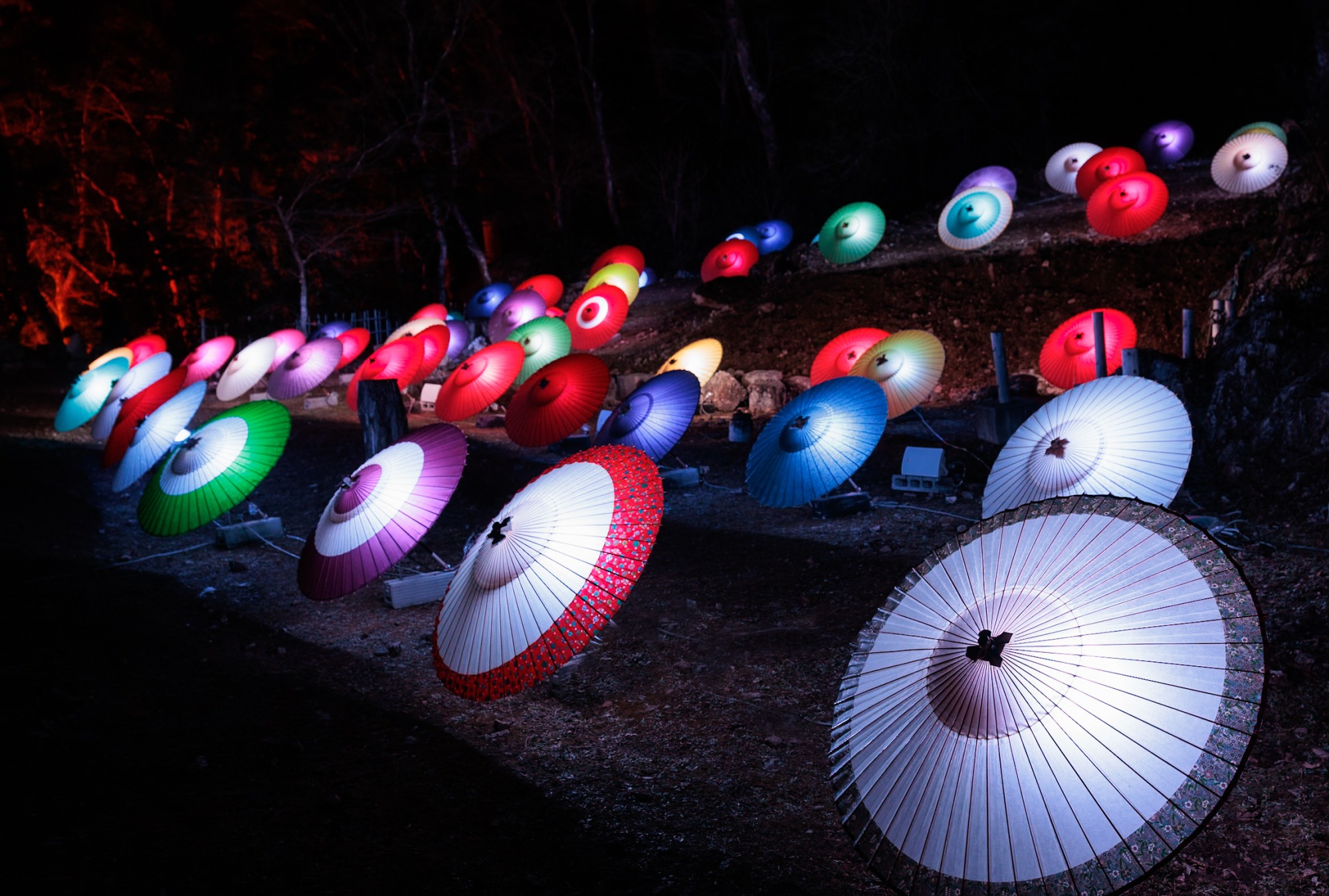 音楽に合わせてライトアップも変化するので色とりどりの和傘の表情を楽しめます。