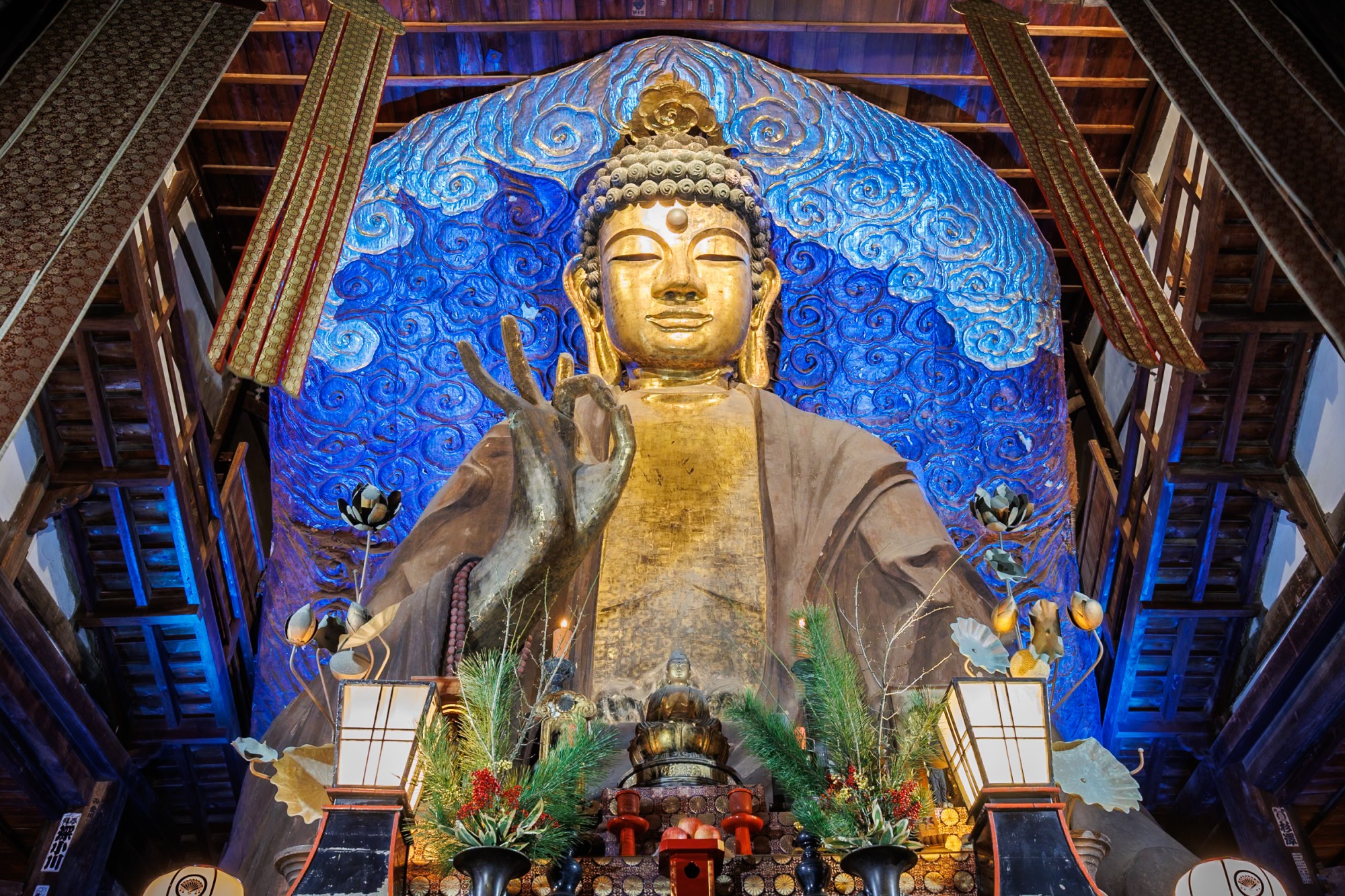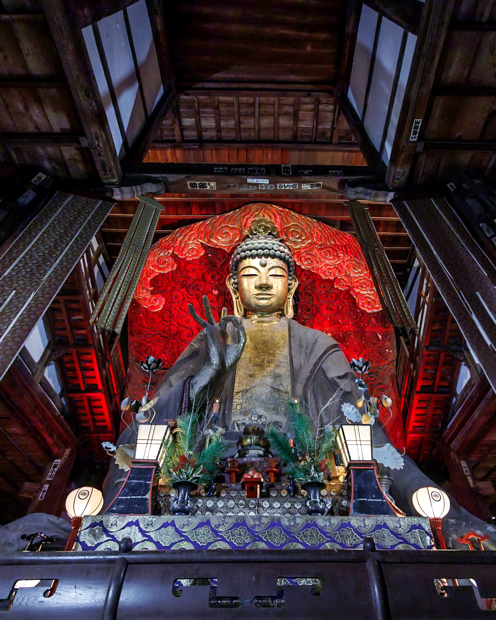 高さ13.7mあり、日本三大仏の一つに数えられ、乾漆仏(かんしつぶつ)としては日本一の大きさ。