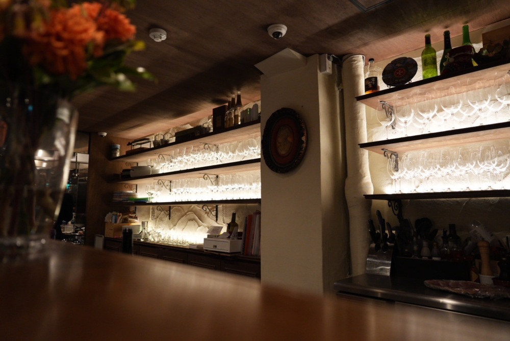 店内にはさまざまな大きさや形のワイングラスが並び、それを眺めるだけでも楽しい雰囲気。