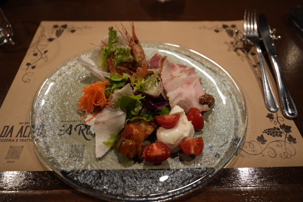 今回注文したのは、「おまかせの前菜盛り合わせ」「ゼッポリーニ(青のりの小さな揚げピザ)」「生ハム盛り合わせ」。