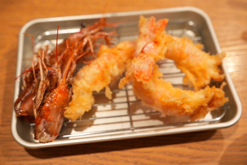 赤海老の天ぷらはレア感が絶妙で感動! 頭も素揚げにして提供され、大満足でした。