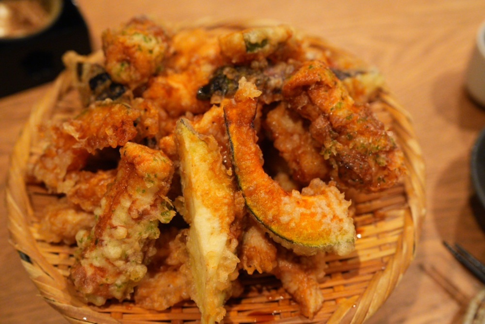 今回注文したのは、「赤海老の天ぷら」「天ぷら盛り合わせ」「昆布締め唐揚げ」「モツ煮込み」「芽キャベツの天ぷら」「さつまいも天ぷら」「椎茸天ぷら」。