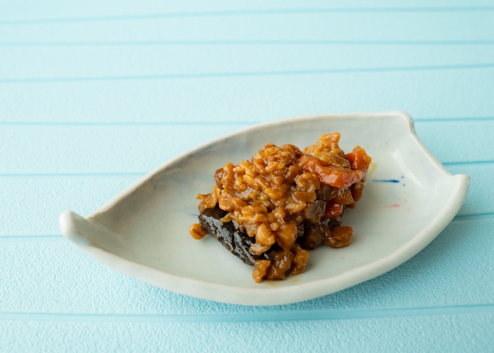 八百津町で醤油、味噌の醸造をしている明治十三年創業の老舗、ヤマコノ味噌平醸造株式会社の「おかずみそ」。小さく刻んだなす、人参、ごぼう、八升芋、生姜が入ったもろみ味噌です。食感の違う野菜がたくさん入っていて、まさに野菜のおかず。体にもよさそうですよね。なすは少し大きめにカットしてあるのが、個人的に嬉しいところです。口に入れるとピリッとした辛みがあり、そのあとで甘み・旨みが広がってきて、味に深みを感じます。