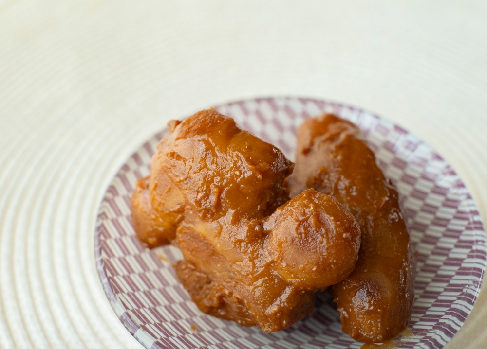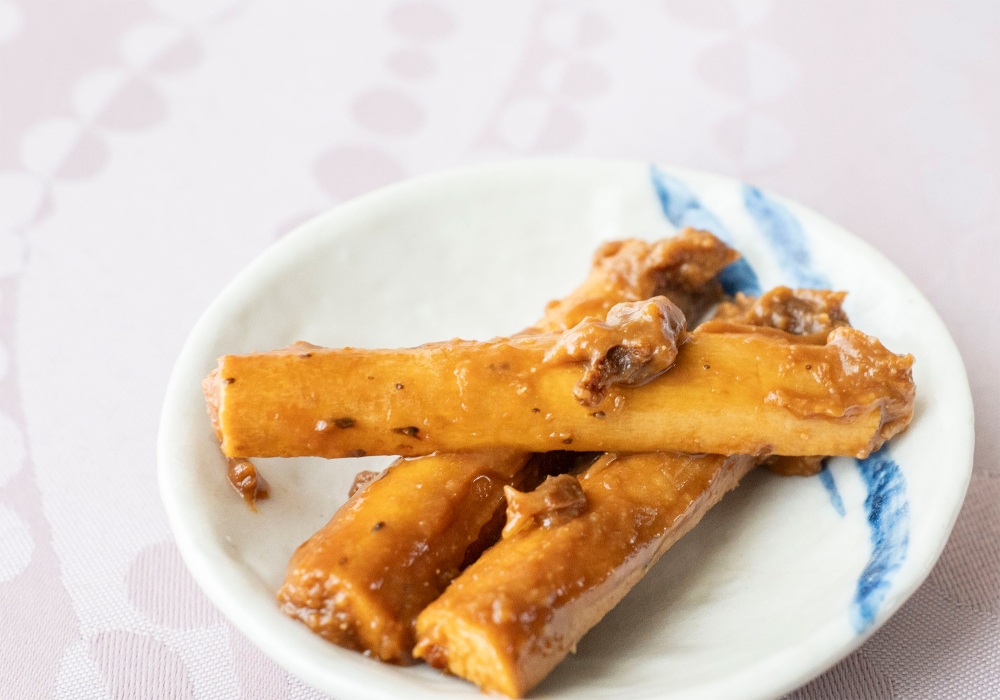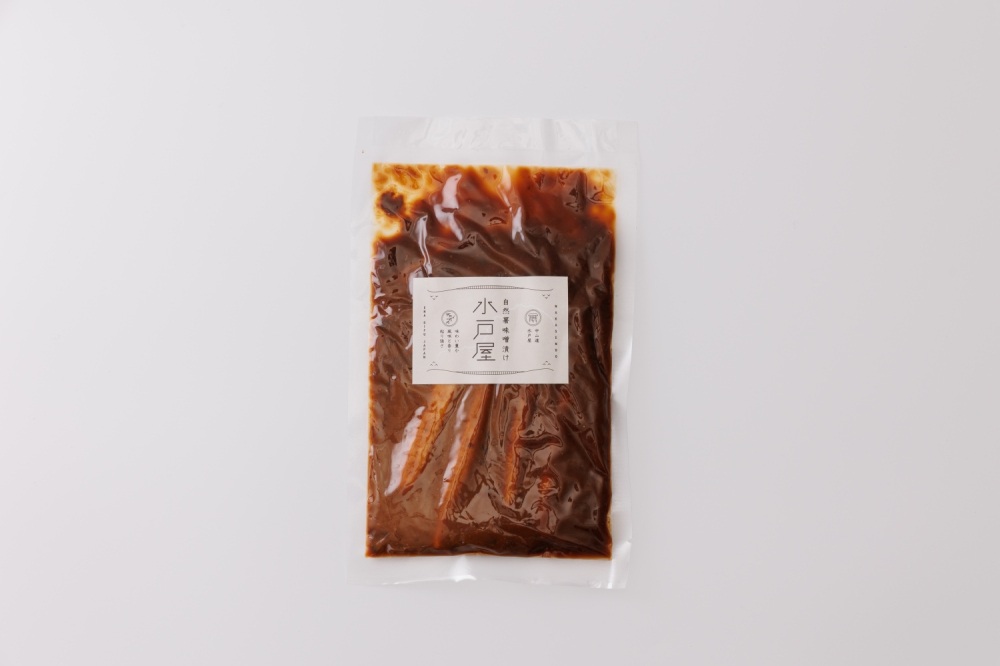 恵那市で自然薯専業農家として、自然薯やその加工品を生産販売している中山道 水戸屋の「自然薯味噌漬け」。5~6センチくらいの長さにカットされた自然薯の味噌漬けが入っています。適当な大きさに切っていただくと、自然薯ならではのシャリシャリとしつつも少し粘り気のある食感と、独特の風味がごはんによく合います。味噌の味がしっかり自然薯に染みこんでいるのは、自然薯を塩漬けしてから味噌で味付けされているからだそう。ごはんだけでなく、お酒も進む!