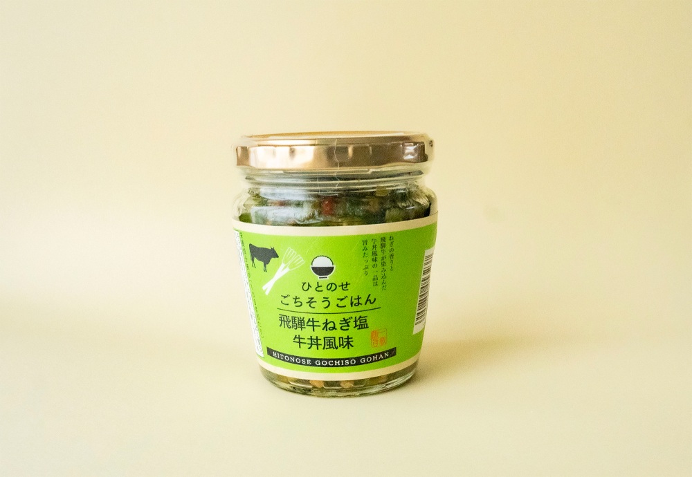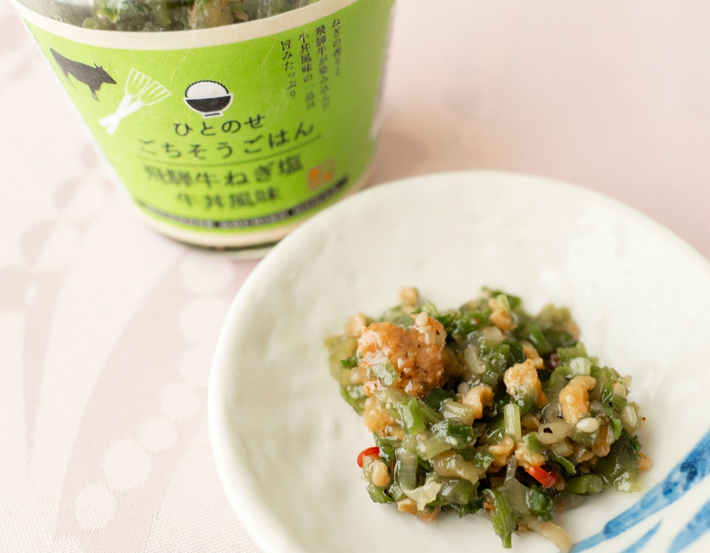 上記と同じく「ひとのせごちそうごはん」シリーズの「飛騨牛ねぎ塩牛丼風味」。たっぷり入ったねぎの塩だれに唐辛子の辛みがピリッと効いています。黒コショウがいいアクセントになっていました。しっかりしたお味なので、がっつりごはんが進みそう。このまま焼き肉などの薬味にも使えそうです。