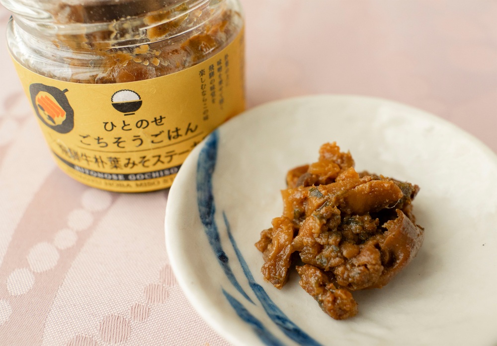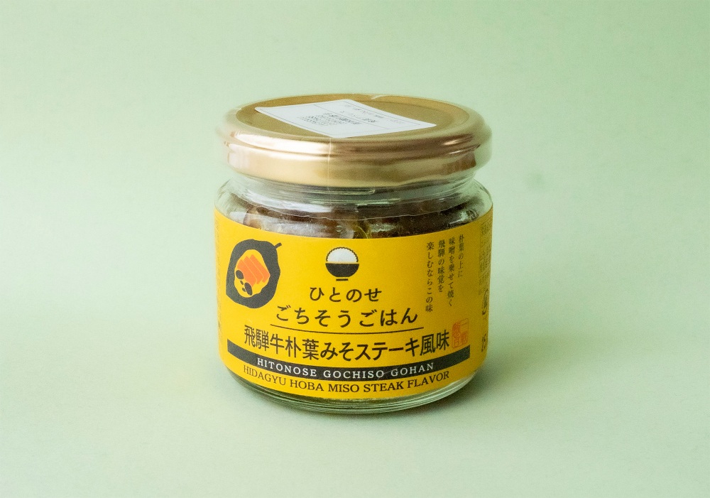 岐阜の食材を使った、ごはんのお供「ひとのせごちそうごはん」シリーズ。「飛騨牛朴葉みそステーキ風味」「飛騨牛ハンバーグ風味(トマト&チーズ) 」「飛騨牛ハンバーグ風味おろしポン酢 」「飛騨牛すき焼き風味 」「くいしんぼうタルタル」など、色々な種類があります。今回は私が食べてみたのは「飛騨牛朴葉みそステーキ風味」。朴葉味噌は、岐阜県飛騨地方の郷土料理で、大きな朴の葉の上で、味噌や野菜、きのこ、お肉などを混ぜて焼きます。「飛騨牛朴葉みそステーキ風味」にはエリンギやしいたけがゴロゴロ。口当たりのいい甘めの味噌で、子どもから大人までおいしく食べられそうです。