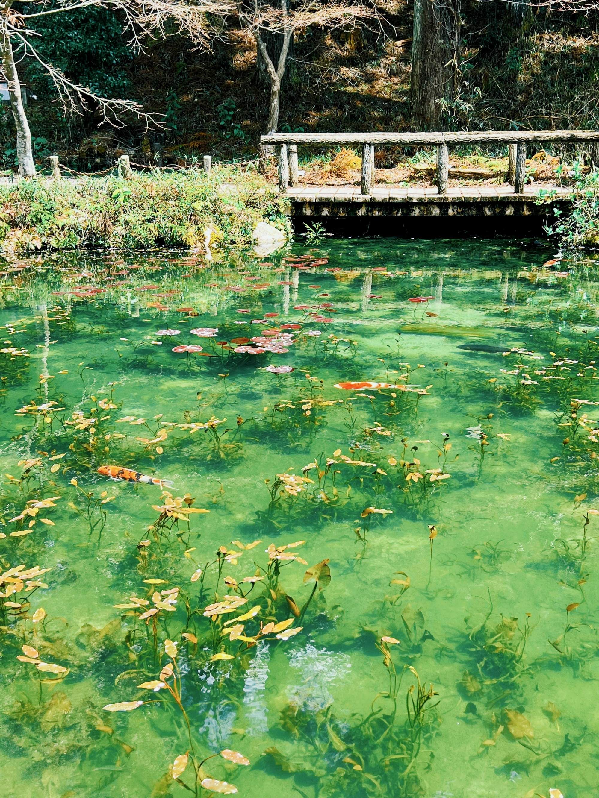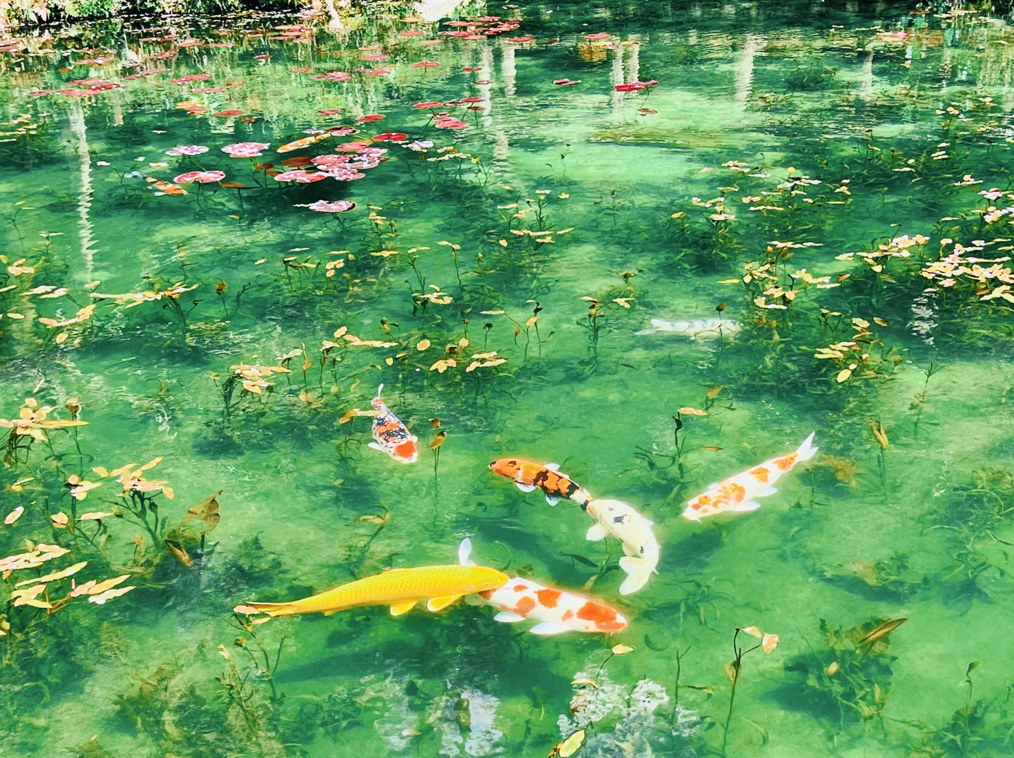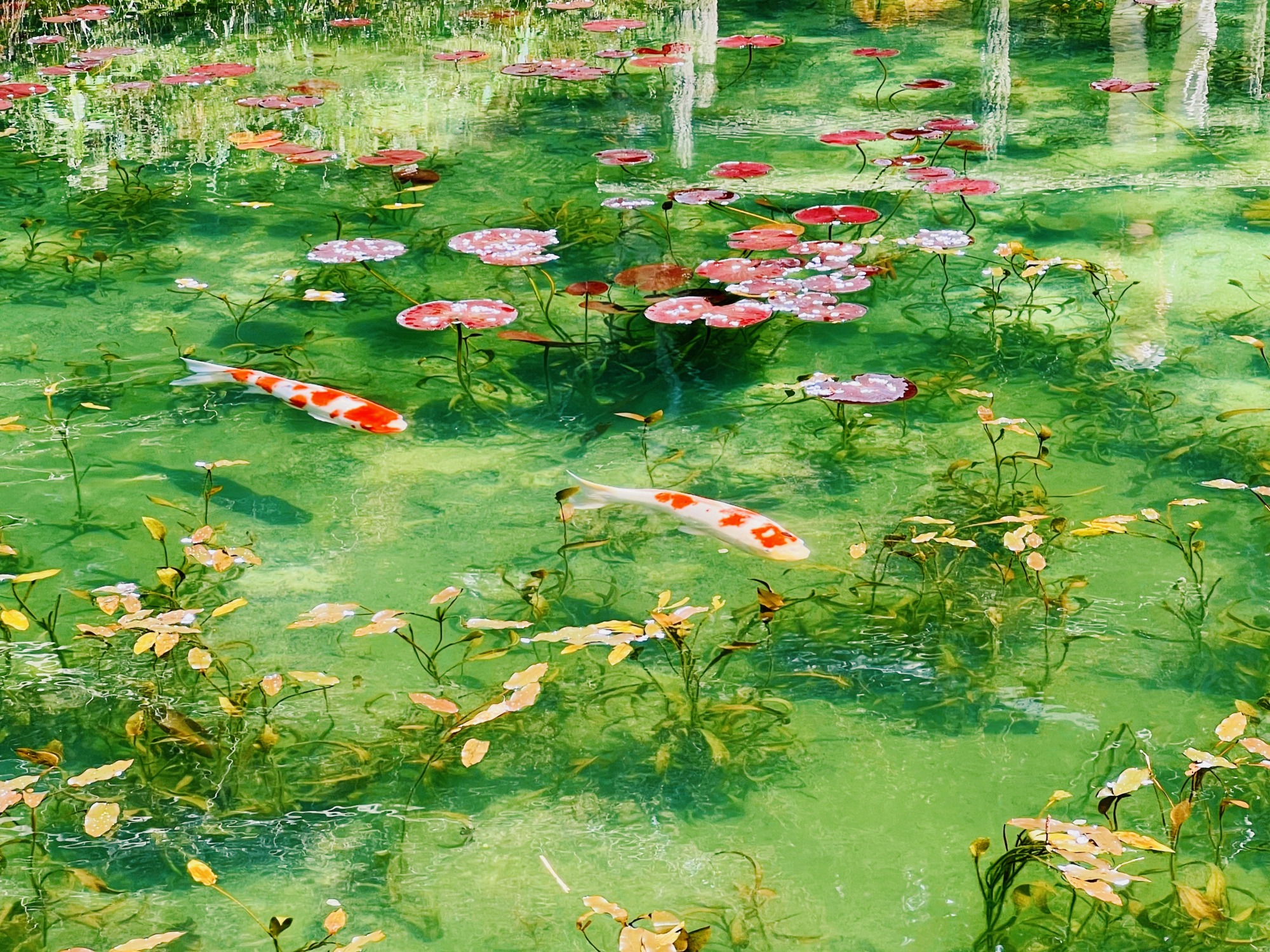 エメラルドグリーンの水を気持ちよさそうに泳ぐ鯉や、水の上に浮かぶ睡蓮の景色はまるで動く絵画のよう。