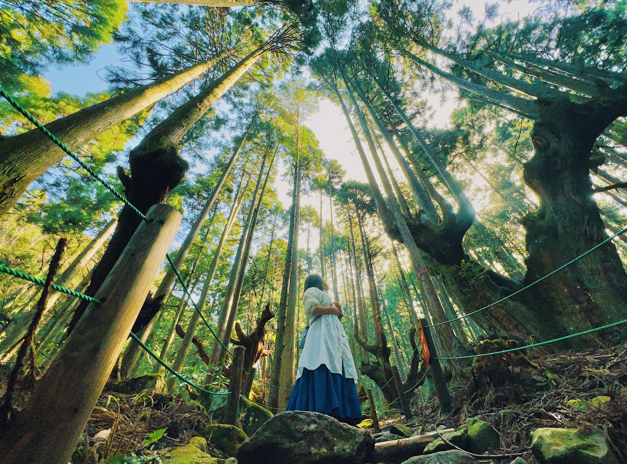キャンプ施設やバンガローなどが並ぶエリアの奥に、まるでジブリ映画「もののけ姫」に出てくるような巨大な株杉の森が広がります。