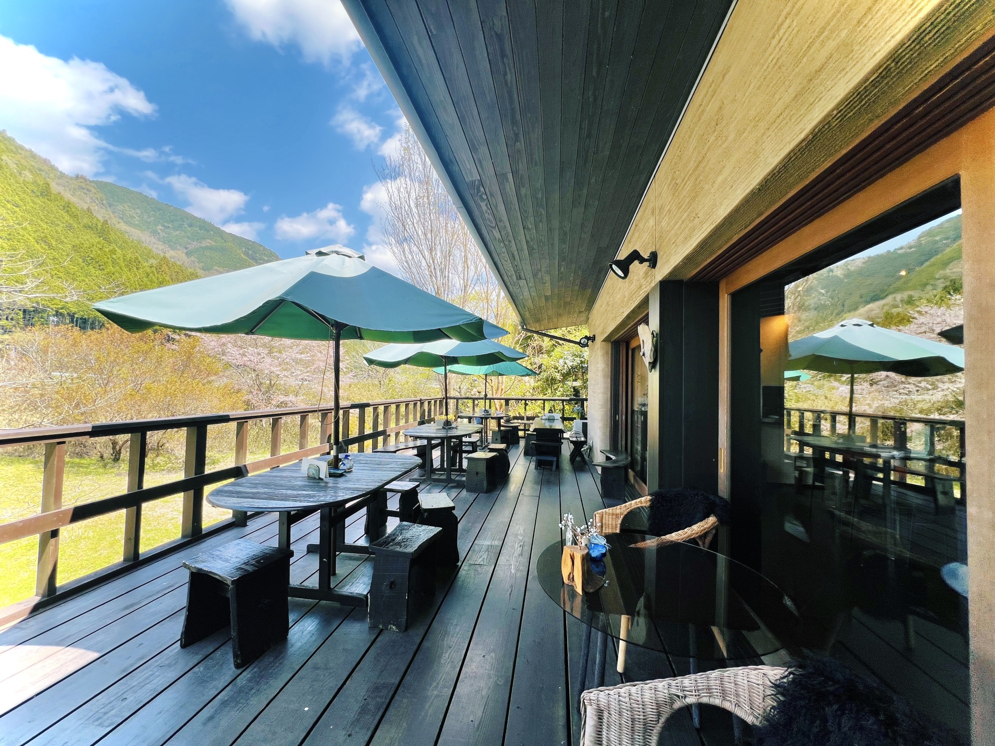 思わず深呼吸したくなるようなおいしい空気と川のせせらぎの音を聞きながら、ゆっくりとお茶や食事を楽しめます。