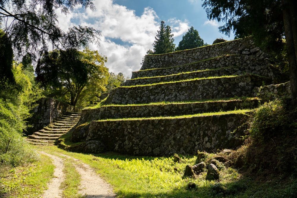 築城は鎌倉時代。そこから、明治の廃城令でその役目を終えるまでのおよそ700年にわたり、城の歴史は続きました。岩村城といえば、まず印象に残るのが石垣です。中でも「六段壁(ろくだんへき)」と呼ばれる石垣は、山の傾斜に合わせて6段に積み上げられており、その姿はまるで石のひな壇のよう。ほかにも、石垣の石の積み方に、時代による違いを見ることができるのも、長い歴史を持つ、この城ならではの見どころです。自然の地形を生かして築かれた石垣からは、長い年月そこに佇み、時代の流れを静かに見守ってきた風格のようなものが感じられます。山の上に、これほどの規模の石垣が残っていることにびっくり。