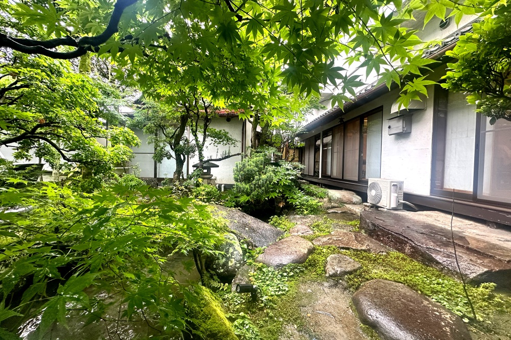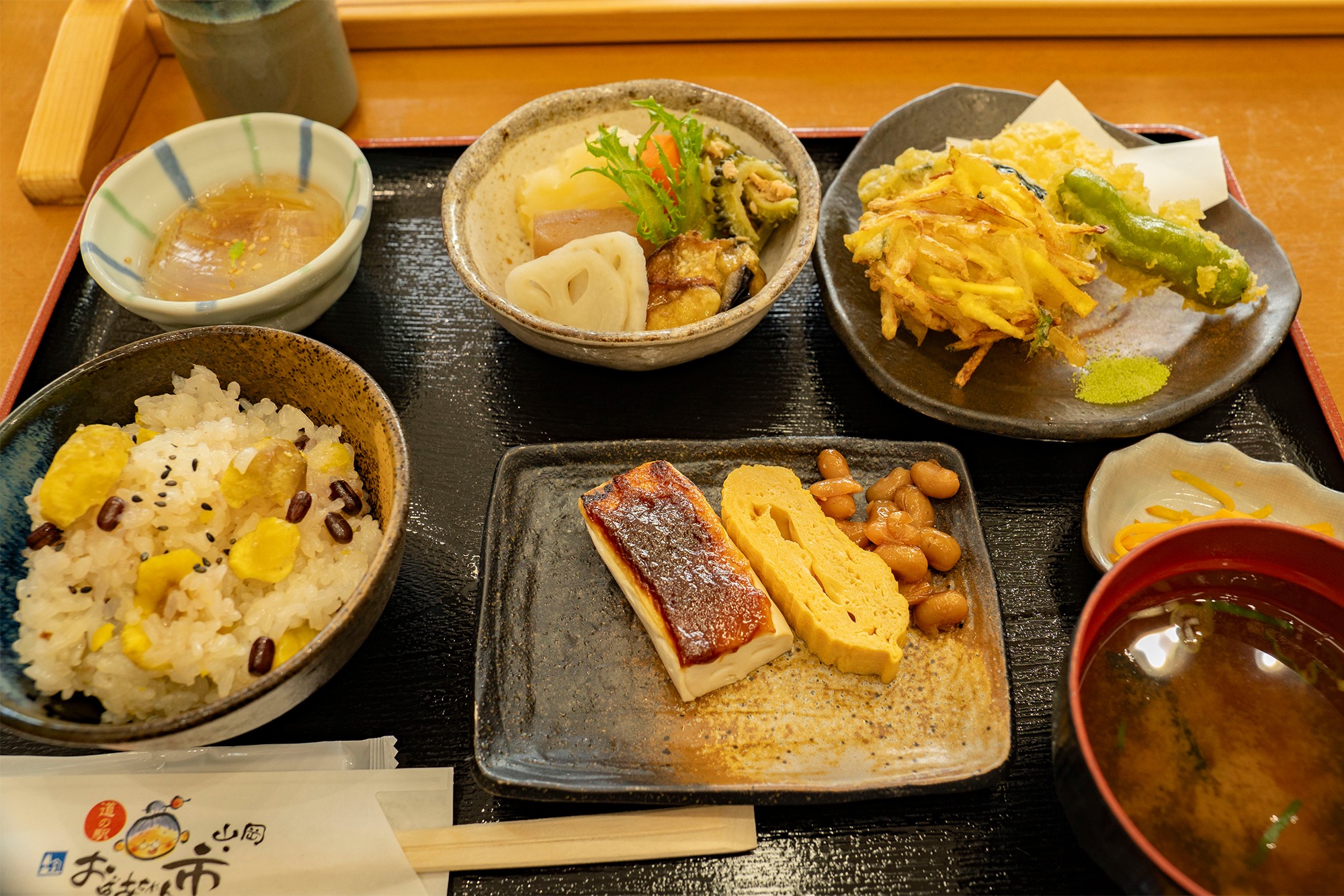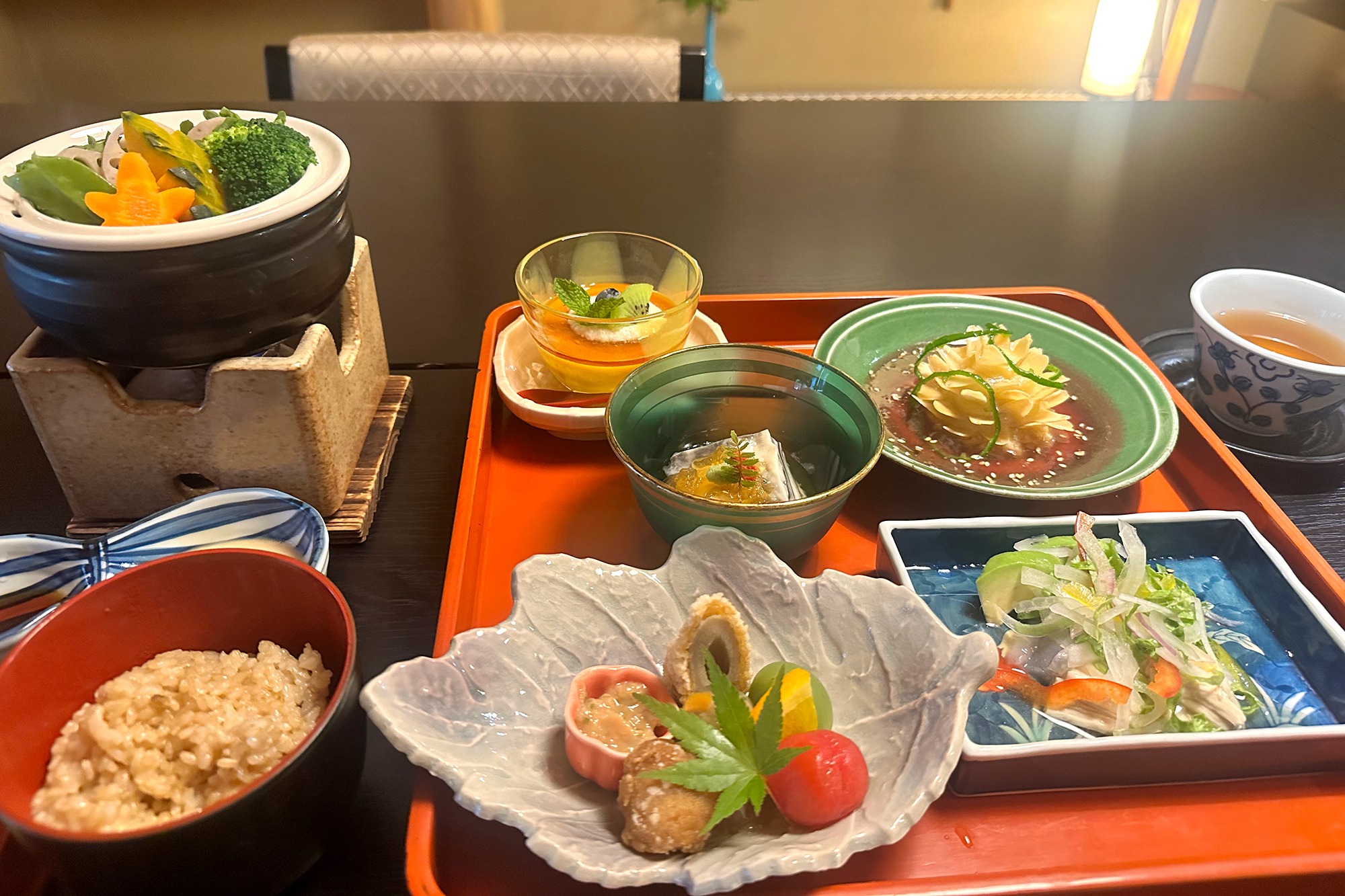 「老舗旅館」と聞くと少し敷居が高く感じられるかもしれませんが、実はこちらでは、日帰りランチがとても気軽に楽しめるんです。私がいただいたのは、地元の食材をふんだんに使った「マクロビオティックらんち 」。地元の食材をふんだんに使った前菜、小鍋、揚げ物、玄米ご飯にお味噌汁、そしてデザートまでついた大満足の内容でした。どのお料理も素材の味を活かした優しい味つけで、一品一品が印象に残るおいしさ!