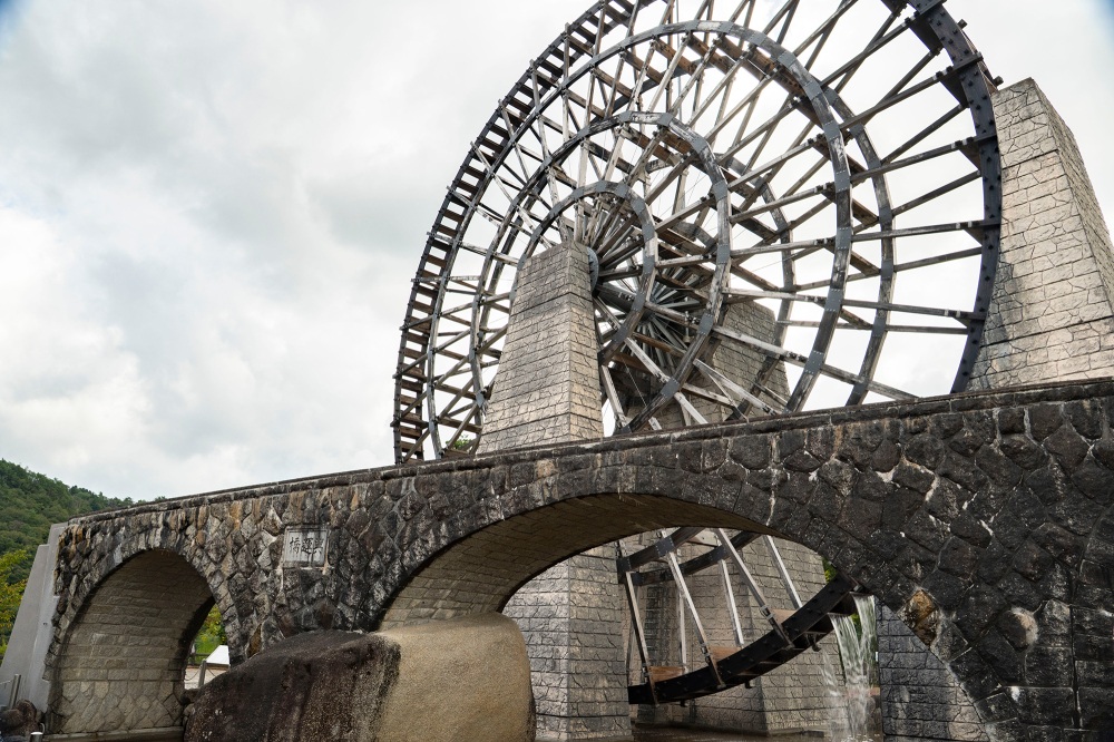 週末になると、駐車場がいっぱいになるほど賑わう、大人気の道の駅「おばあちゃん市・山岡」。この道の駅のシンボルが、直径24メートルという日本最大級の木製水車です。ゆっくりと水しぶきをあげながら回転する様子は、迫力があり思わず見入ってしまいます。この水車は、2004年の小里川(おりがわ)ダム完成に合わせて設置されたものです。かつてこの地域には多くの水車があり、陶石を砕くなどの作業に使われていたそう。ダム建設で水没した、そうした地域の記憶や産業の歴史を受け継ぐため、産業遺産のシンボルとして造られたのが、この巨大な木製水車なのだとか。