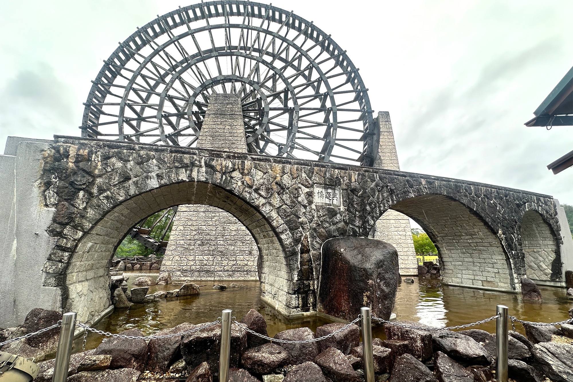 水車のすぐ下には、大正時代に造られた與運橋(ようんばし)という三連アーチの石造りの橋があります。当時、小里川第三発電所へ向かうために使われていた橋が、移設・保存されたもので、水車とともに趣のある景観をつくっています。