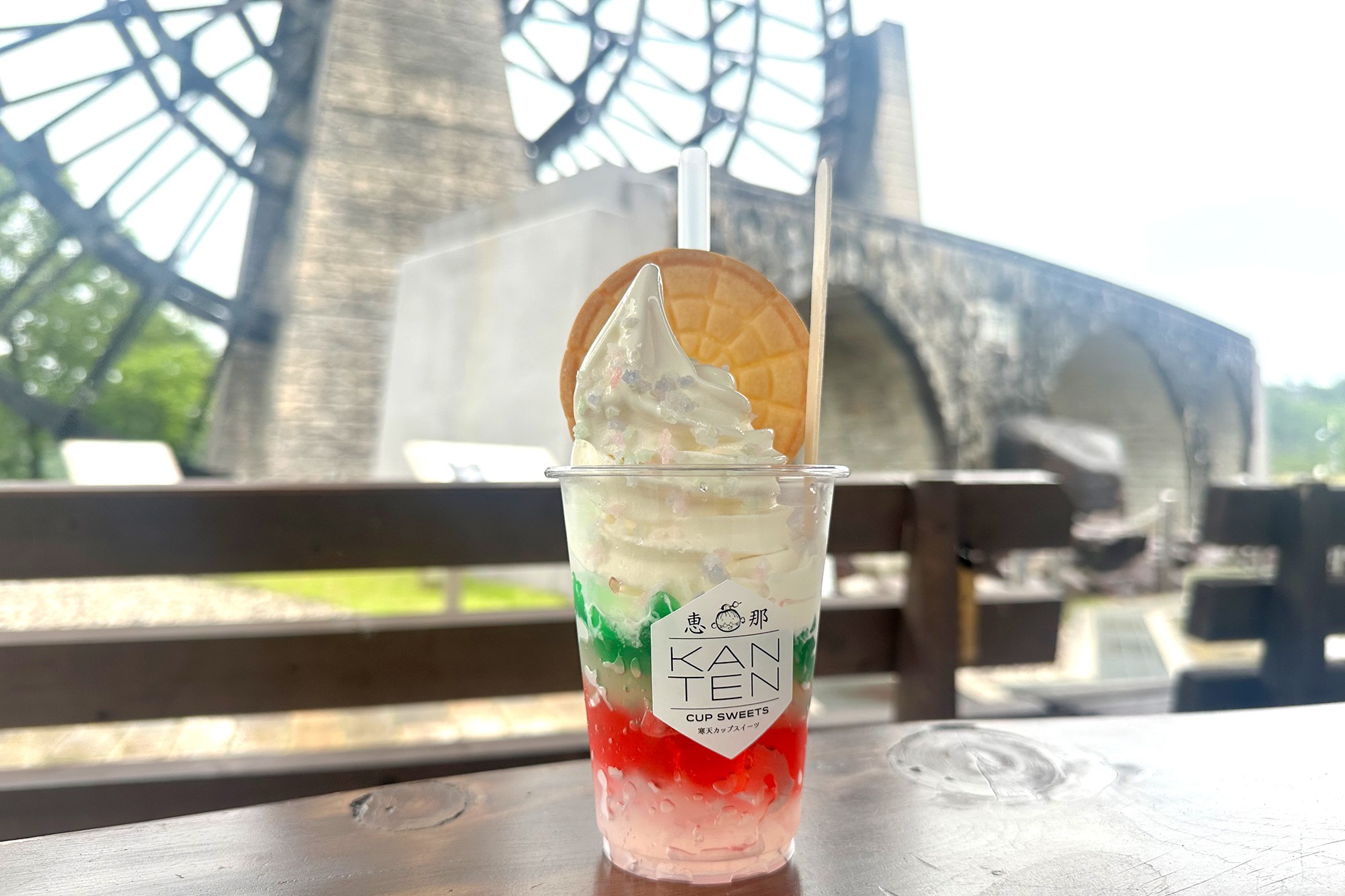 道の駅「おばあちゃん市・山岡」には、私も食事と手作り惣菜目当てに何度も訪れています。特に、道の駅の中にある食事処「みはらし茶屋」でいただける、地元産の野菜や季節の山菜などを使った定食はおすすめです!写真は去年いただいた季節限定の「栗おこわ定食」。他にもその時期に応じた季節限定の定食があるので、ぜひチェックしてみてください。また、山岡名産の寒天スイーツもいただけます。カラフルな寒天パフェは、シャリッとした琥珀糖の食感とソフトクリームの組み合わせが楽しい。トッピングされている、塩麹入りのクッキーは「水車」をイメージしているんだそうです。