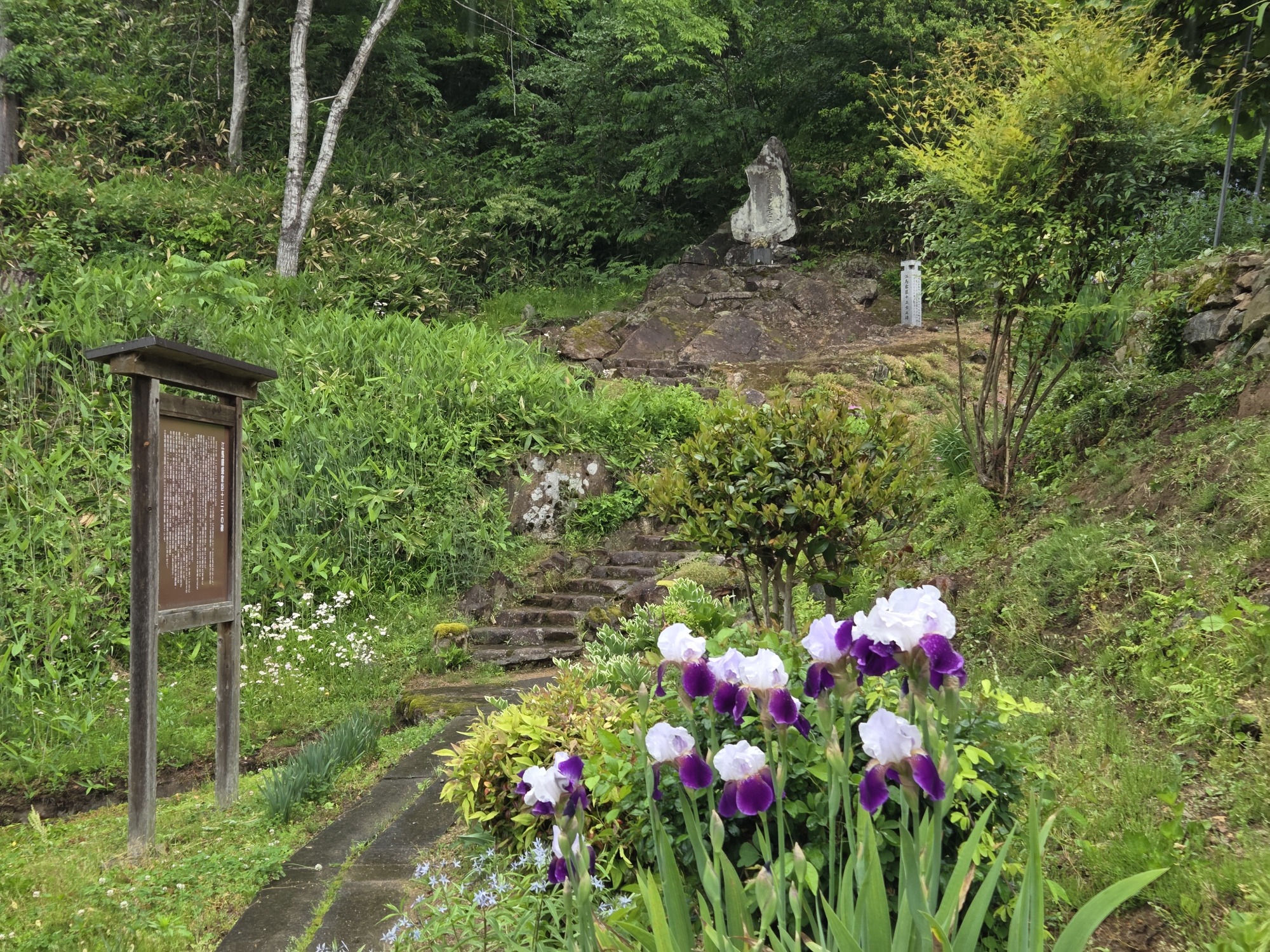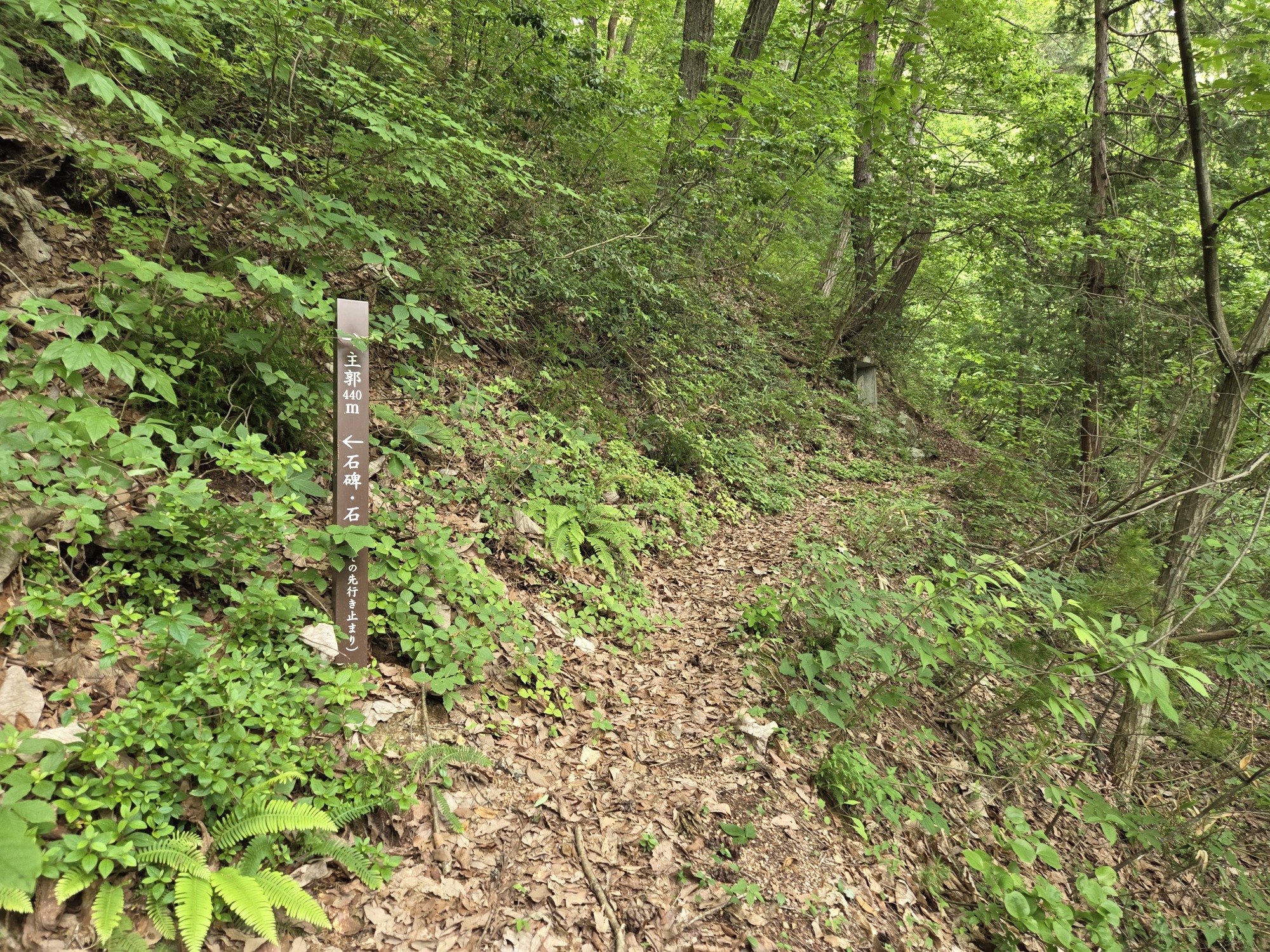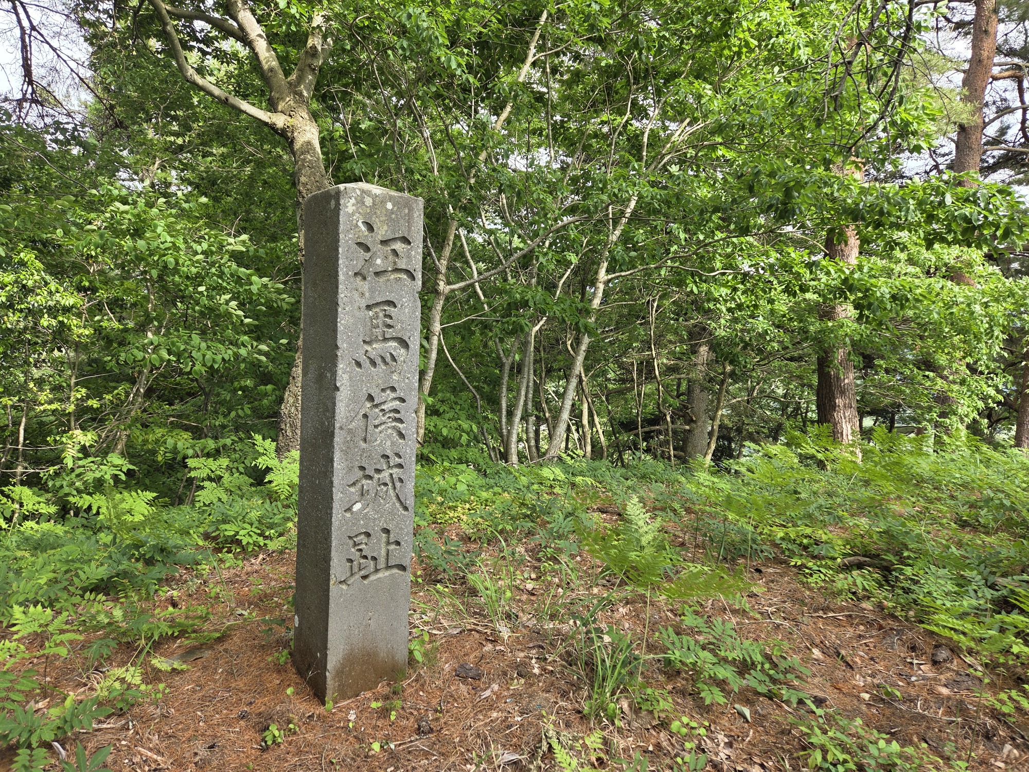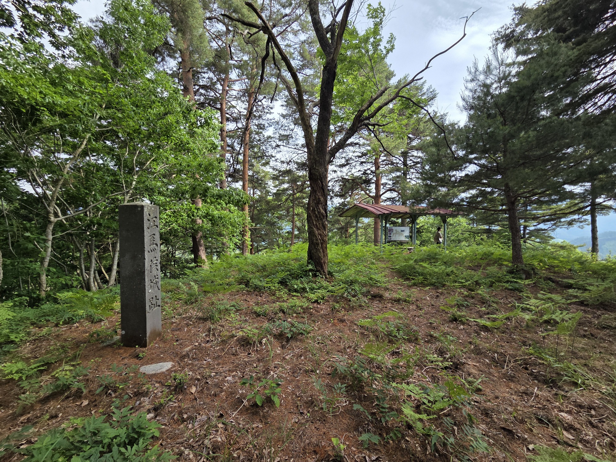 いよいよ今回の最終到達点である「主廓」へ。小高い丘のような場所に平坦な敷地が広がり、屋根付きのベンチと「江馬候城趾」と刻まれた石碑が建つのみ。