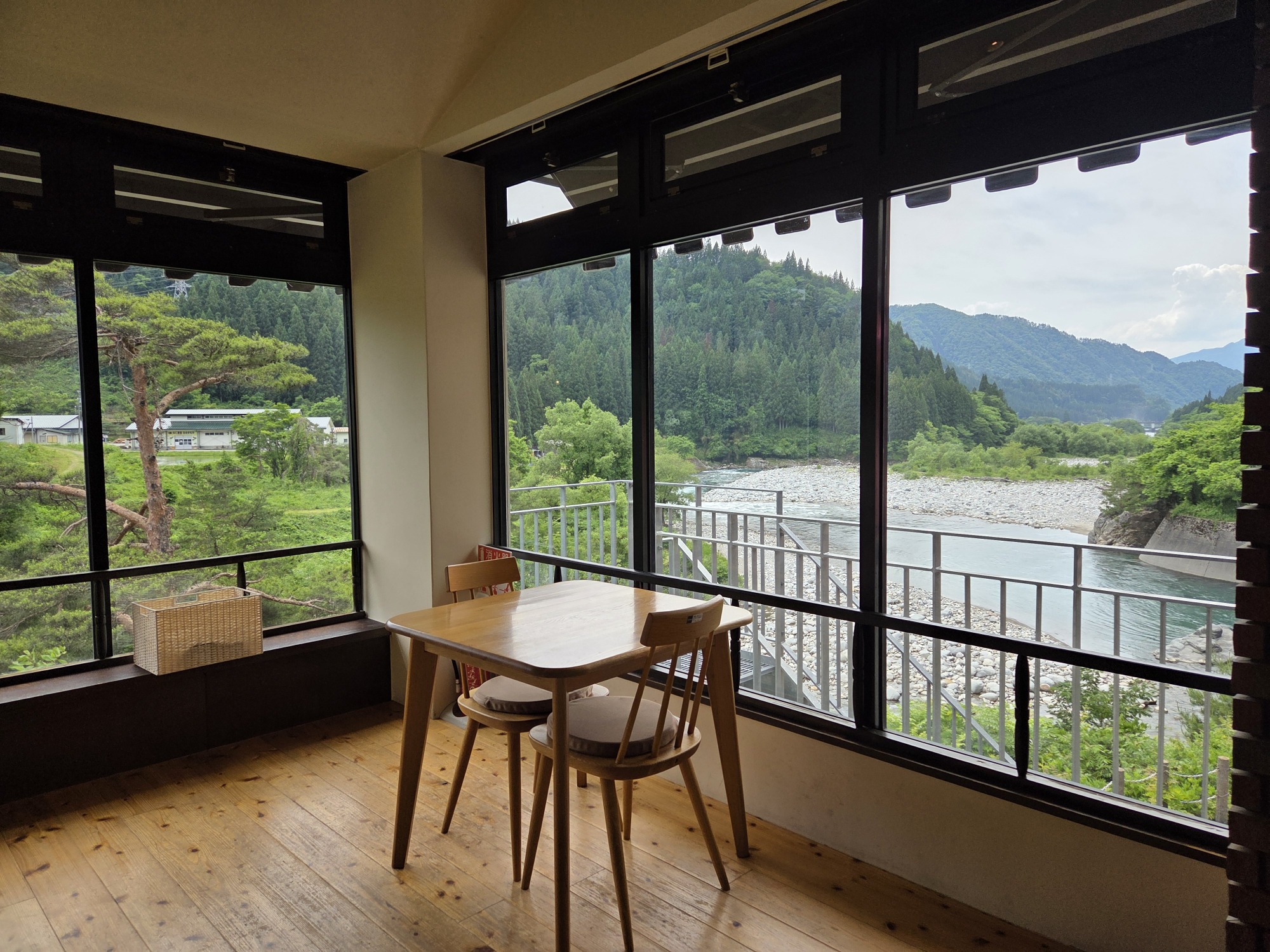 レストランは、金木戸川が神通川水系の高原川に流入する地点にかかる駒止橋のたもとに位置し、店内は高原川のさわやかな景観が一望できる開放的な窓が特徴的。
