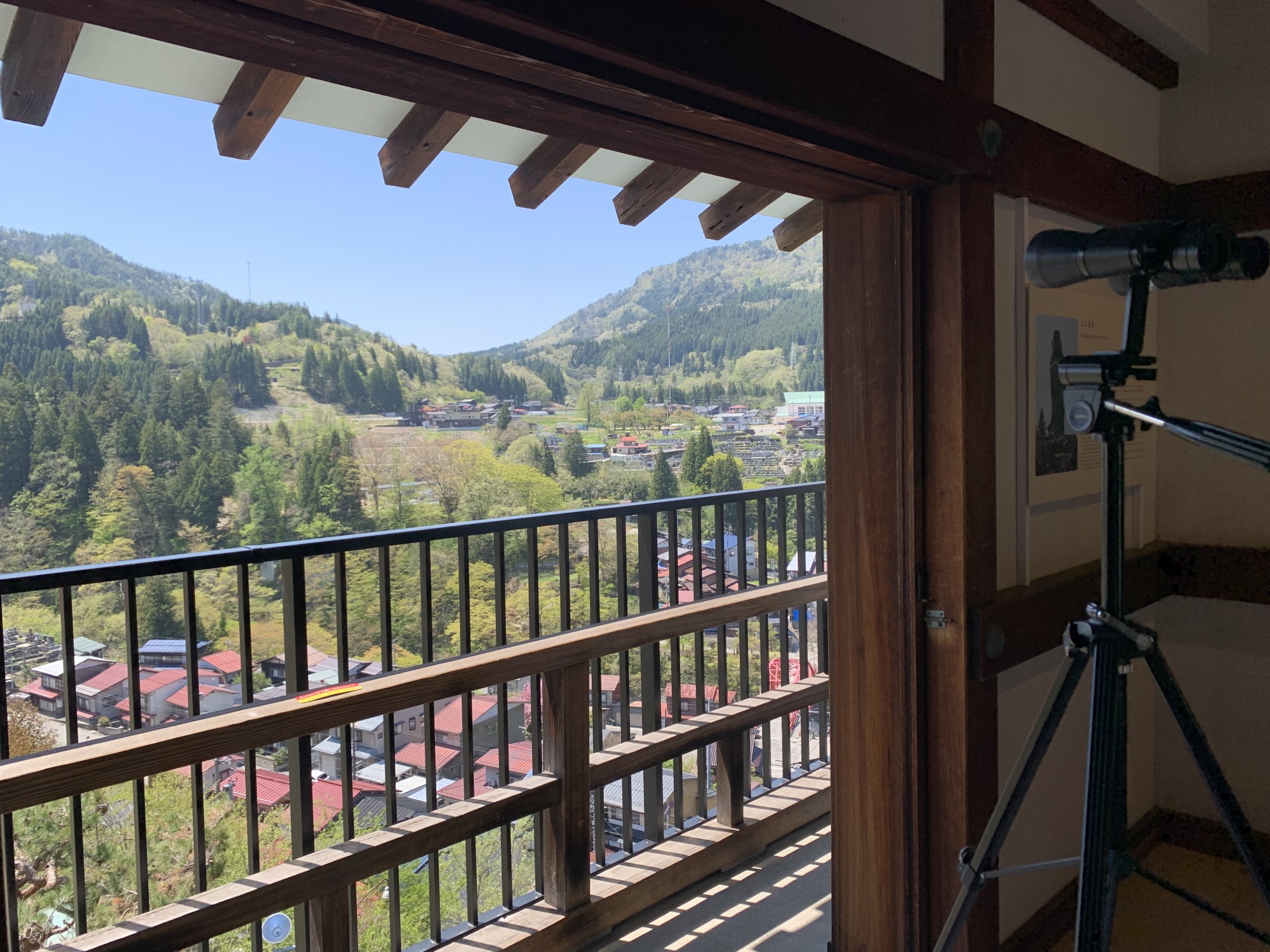 最上階の3階は、展望台になっていて神岡の町並や山々が一望できます。展望台から見える観音山には像高8.9mの立ち達磨があり、設置されている望遠鏡で見ることができます。