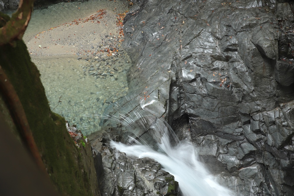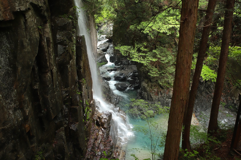 なかでもひときわ存在感を放つのが「観音滝」。幅広の岩盤をつたって一直線に滑り落ちるその姿は、ダイナミックでありながらも繊細さを感じさせます。エメラルドグリーンの滝壺も見事です。